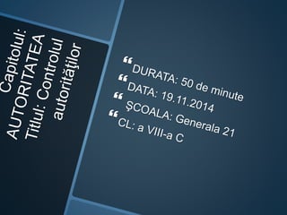 Documentul discută raporturile dintre cetățeni și autorități, abordând competențe precum separarea puterilor în stat și echilibrul acestora. De asemenea, se subliniază importanța presei în democrație și exercitarea controlului de către cetățeni asupra autorităților. Lecția încurajează elevii să definească termenii cheie pentru a asigura retenția informațiilor.