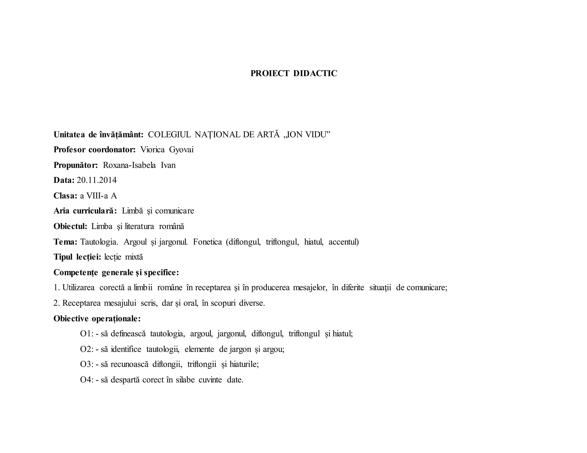 Documentul descrie un proiect didactic pentru clasa a VIII-a la Colegiul Național de Artă „Ion Vidu”, coordonat de profesorul Viorica Gyovai. Lecția abordează tema tautologiei, argoului, jargonului și foneticii limbii române, utilizând metode diverse pentru a asigura învățarea activă și evaluarea continuă a elevilor. Obiectivele operaționale se concentrează pe definirea și identificarea acestor noțiuni lingvistice și pe dezvoltarea abilităților de comunicare corectă în limba română.