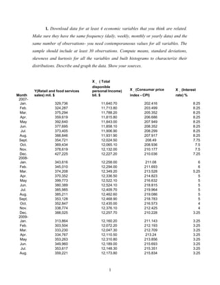 The document analyzes the relationship between retail and food service sales (dependent variable) and three economic indicators (independent variables) using regression analysis. It finds that a regression model with personal income, CPI, and interest rate provides the best fit for the data, with each variable having a statistically significant relationship to sales.