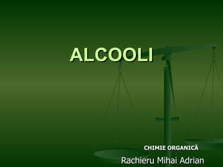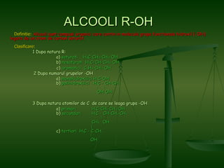 Alcoolii sunt compuși organici ce conțin grupa funcțională hidroxil (-OH) legată de un atom de carbon saturat, și se clasifică în funcție de natura grupelor și atomilor de carbon. Metodele de obținere includ hidroliza, reducerea compușilor carbonilici și fermentația, iar proprietățile chimice variază de la deshidratarea la oxidare. Exemplele importante de alcool includ metanolul și etanolul, care au utilizări industriale diverse, inclusiv ca solvenți sau combustibili.
