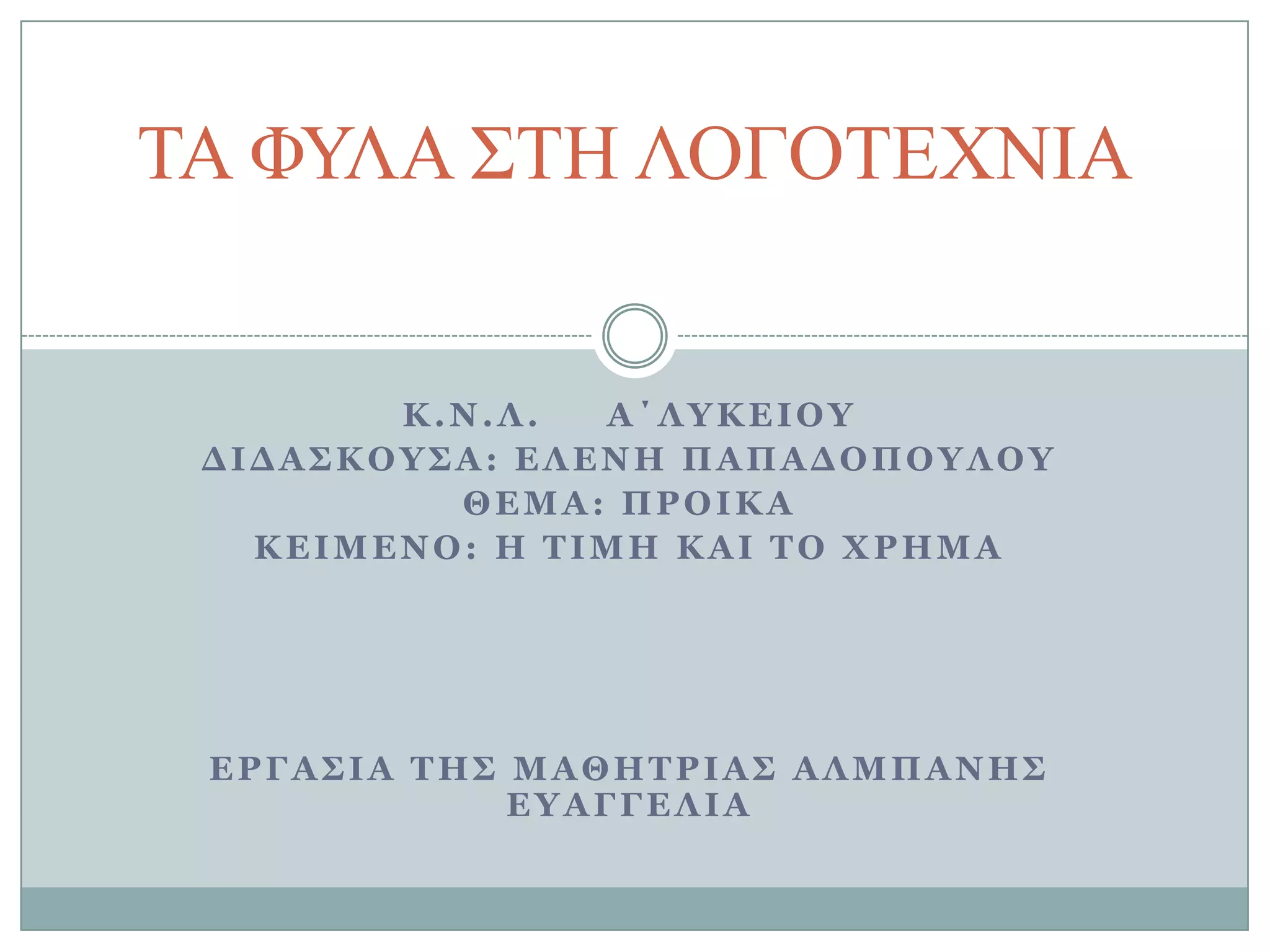 ΛΟΓΟΣΔΥΝΗΑ Κ.Ν.Λ. Α΄ΛΤΚΕΙΟΤ ΔΙΔΑΚΟΤΑ: ΕΛΕΝΗ ΠΑΠΑΔΟΠΟΤΛΟΤ ΘΕΜΑ: ΠΡΟΙΚΑ ΚΕΙΜΕΝΟ: Η ΣΙΜΗ ΚΑΙ ΣΟ ΥΡΗΜΑ ΕΡΓΑΙΑ ΣΗ ΜΑΘΗΣΡΙΑ ΑΛΜΠΑΝΗ ΕΤΑΓΓΕΛΙΑ