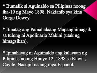 Pumasok ang mga Amerikano sa Maynila noong Mayo 1, 1898, kung saan naganap ang labanan sa pagitan ng mga Amerikano at Espanyol. Nakipagtulungan ang mga Pilipino sa mga Amerikano at nagtagumpay ang mga ito sa laban. Si Emilio Aguinaldo, ang unang pangulo ng Republika ng Pilipinas, ay ipinahayag ang kalayaan ng bansa noong Hunyo 12, 1898.