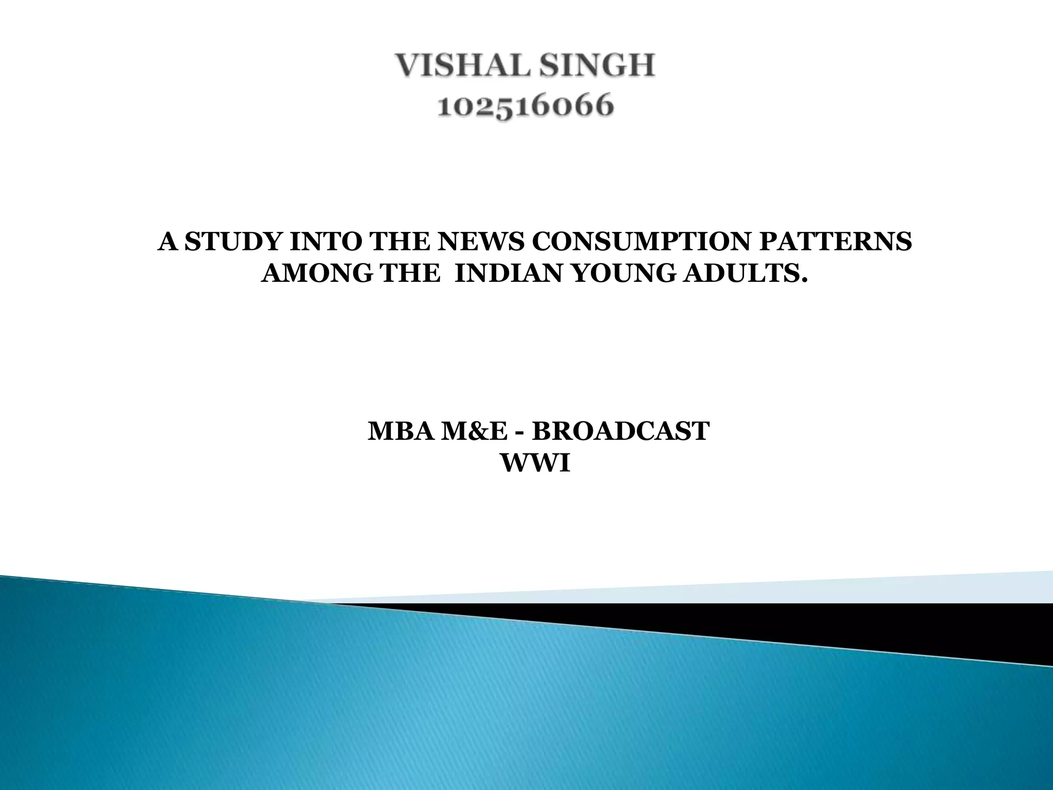 The document discusses the results of a study into the news consumption patterns of young Indian adults aged 18-30. It finds that while traditional media is losing popularity, digital media is bringing young people back to news through different distribution platforms. Traditional notions that young people don't care about news are wrong - the genres of news consumed vary and include entertainment, sports, international and business news. Young adults prefer accessing news online for convenience and on platforms like laptops and smartphones. While new devices are popular for news, television remains the most enjoyable platform. The study provides insights into optimizing news delivery to this demographic across different media.