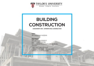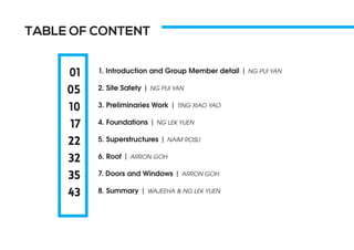 The document discusses the preliminary works being carried out at a construction site. It describes how site clearance is the first step, involving demolishing existing structures, removing vegetation, and leveling the land. Formwork and scaffolding are then erected to support concrete works during construction. Temporary site facilities like welfare buildings and storage areas are also set up to support workers.