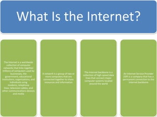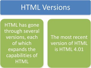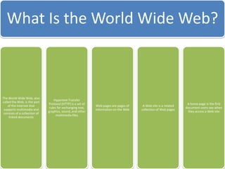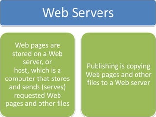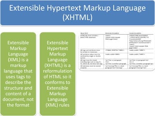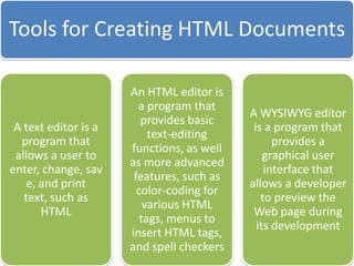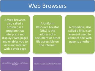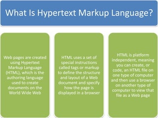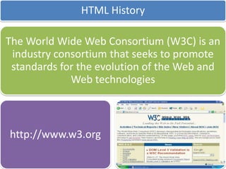 This document discusses different types of websites and their purposes. It covers electronic commerce websites that allow buying and selling of goods online. It also mentions HTML elements which are used to structure and present content on web pages. Finally, it discusses the web development life cycle for designing and developing websites.