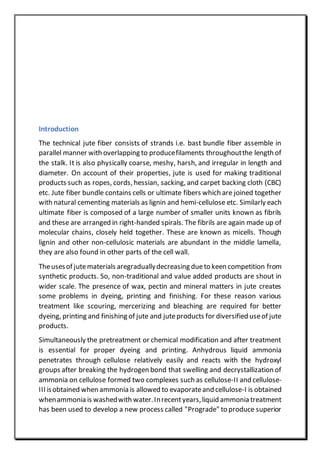 3. The chemical composition and properties of jute fiber which is primarily cellulose. Pretreatment processes like scouring and bleaching are used to remove impurities before dyeing or finishing jute fabrics.