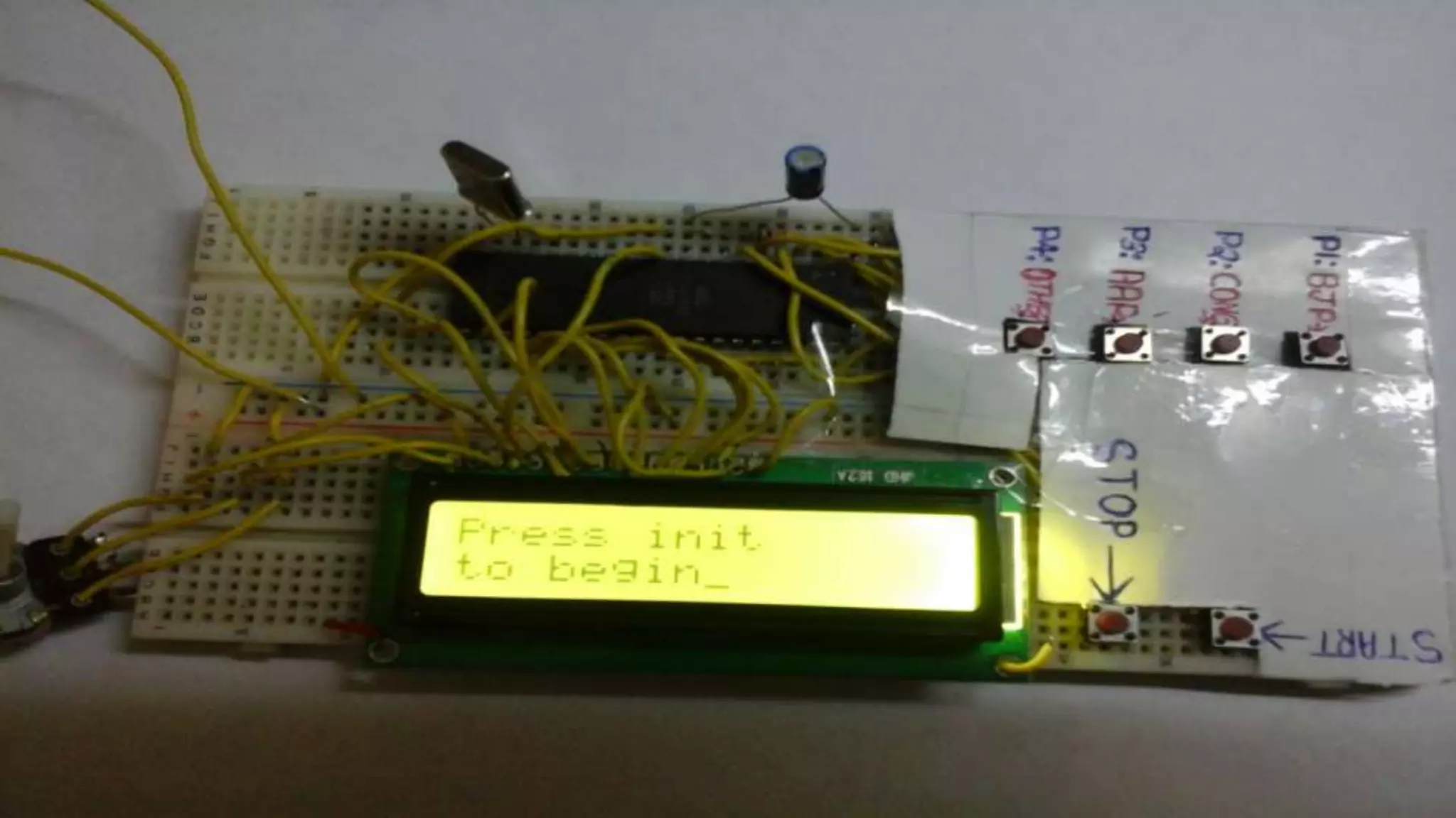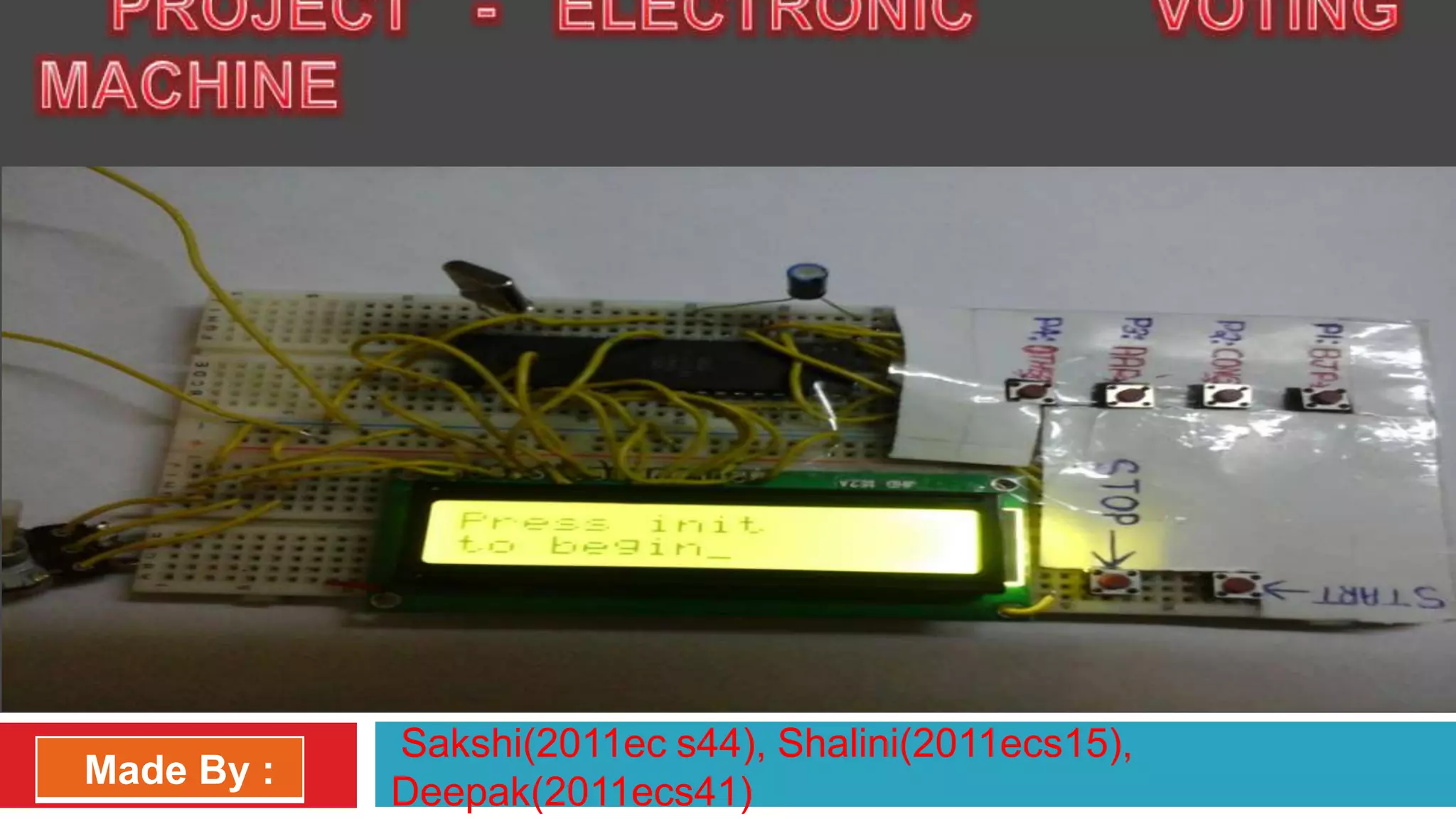This document describes an electronic voting machine project created by three students using an AT89C51 microcontroller. The project uses KEIL software to create a hex file that is burned onto the microcontroller using a PHYTON CHIPPROG programmer. The hardware includes an LCD, microcontroller, crystal, resistors, capacitor, potentiometer, buttons, and a breadboard. Voters can select from four parties by pressing labeled buttons and results are displayed by pressing a stop button. Potential improvements include adding reject and confirmation buttons, fingerprint authentication, and connecting it to GSM for mobile voting.