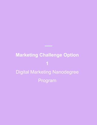 The document provides information about a digital marketing nanodegree program. The objective is to attract potential students to the program by getting them to provide their email addresses. This will be done through a landing page where people can download a free ebook on social media advertising by entering their email. The goal is to collect 1000 unique emails by the end of December. The key performance indicator that will be used to measure marketing success is the number of unique emails collected.