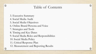 Chipotle's social media goals for the year are to increase engagement to build trust, share more engaging content to attract consumers, and emphasize fresh, local ingredients. Objectives include increasing engagement on networks and creation of relevant content. An audit found Facebook had the most followers and engagement, while LinkedIn had the least. The strategy involves increasing followers across networks through interactions and content, increasing trust by publishing more healthy food content, and boosting Instagram followers. Progress will be reported after 3 and 6 months.