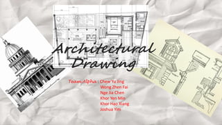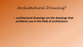 The document discusses architectural drawings and their purpose and components. Architectural drawings are used by architects to design buildings and communicate designs to clients and contractors. They include floor plans, site plans, elevations, sections, and detail drawings. Important architects mentioned include Imhotep, who designed the step pyramid of Djoser in ancient Egypt, and Le Corbusier, a pioneer of modern urban planning.