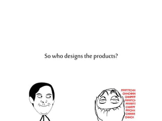The document discusses product design, including what it is, the process involved, and the roles of different teams. It states that product design is the process of creating and developing new products, and involves detailed study of manufacturing. It also outlines the key stages of product design such as research, concept design, detail design, development, and production. The main teams involved are design, manufacturing, research, and marketing.