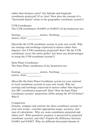 The document outlines an educational project focused on creating geographic and thematic map projections, requiring students to generate a reference map featuring their hometown along with a thematic map based on poverty rates in a selected country. It involves understanding and comparing different coordinate systems (geographic, UTM, state plane), documenting map projections and their properties, and submitting a comprehensive report with visuals. The project emphasizes accuracy, proper citation, and a detailed understanding of cartographic techniques to meet assignment criteria.