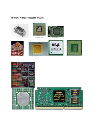 An integrated circuit called a microprocessor contains the central processing unit (CPU) of a computer on a single silicon chip. Microprocessors differ based on their instruction set, bandwidth, and clock speed. Common microprocessor manufacturers include AMD, Intel, NEC, Siemens, and Toshiba. The Intel 8085 is an 8-bit microprocessor with a multiplexed address/data bus that was widely used in the 1970s-1980s.