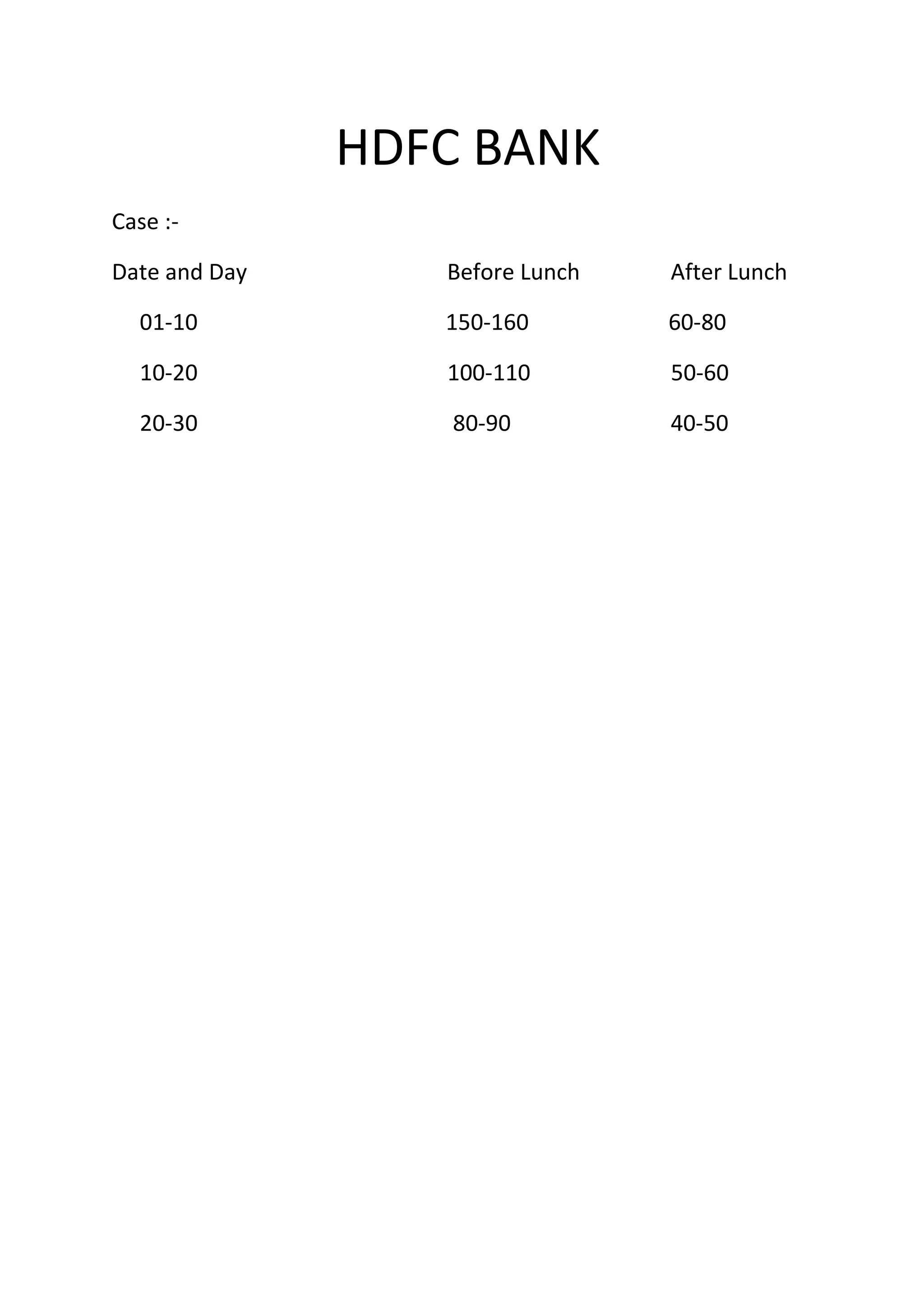 The document summarizes queueing analysis for customer wait times at an HDFC Bank branch on a given date. [1] Before lunch, the arrival rate was 120-140 customers and the average wait time was 5-7 minutes with 30 customers waiting. [2] After lunch, the arrival rate dropped to 60-80 customers and the average wait time remained 5-7 minutes but with 20 customers waiting. [3] Between 10-20, the arrival rate was 80-100 customers before lunch and 30 customers after lunch. The average wait times were 3 minutes before lunch and 2-3 minutes after lunch.