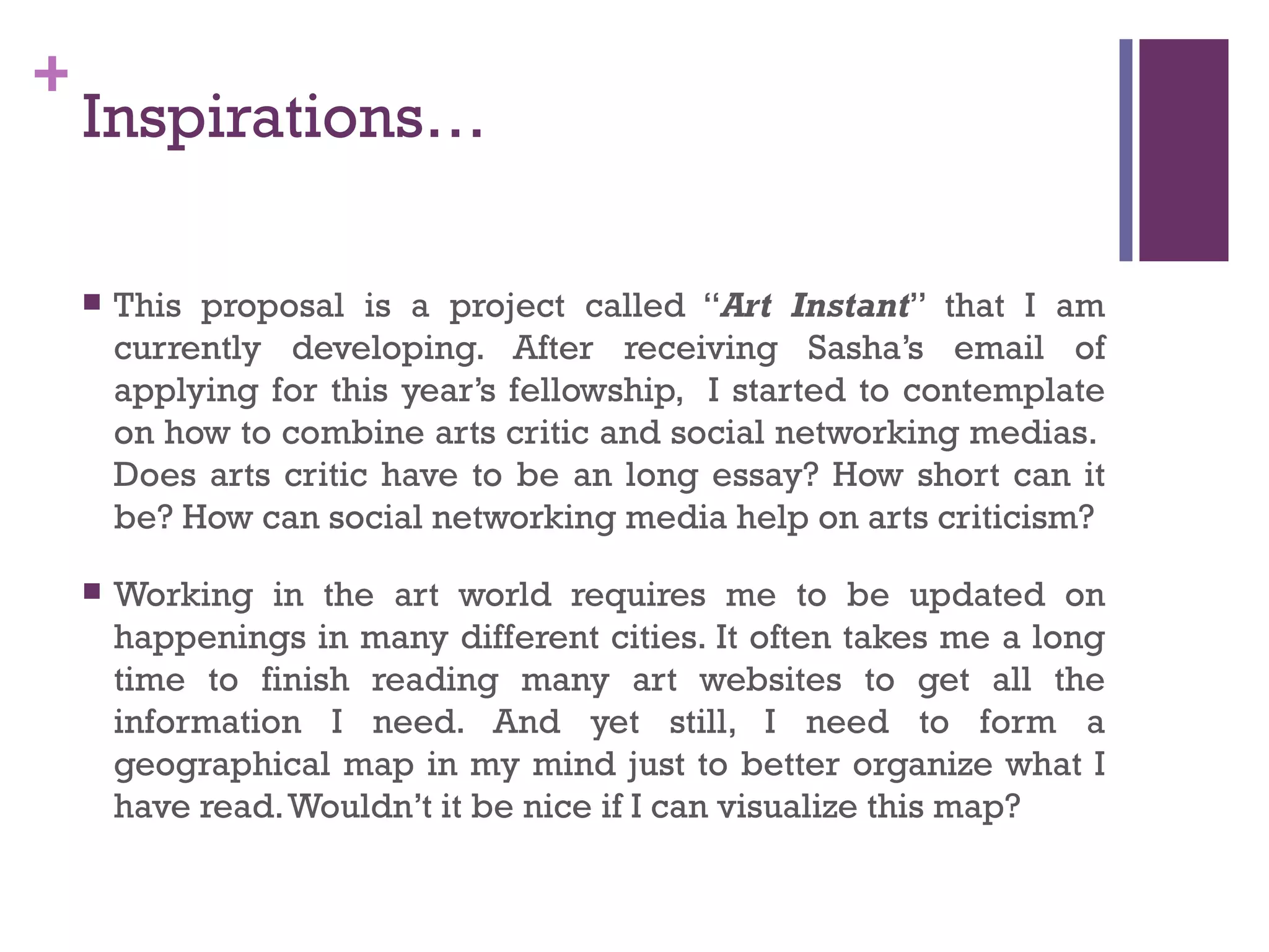 The proposal argues this app could provide a new platform for arts coverage and criticism by empowering anyone to be an arts reporter within their community. It would help arts journalists stay connected locally and virtually.