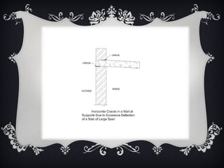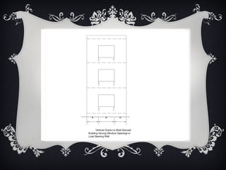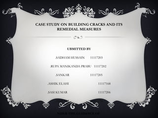 This project case study addresses the causes, classifications, and remedial measures for building cracks. Cracks are categorized into structural and non-structural, caused by various factors such as overloading, thermal movement, and ground movements. Effective repair methods were discussed, including epoxy injection, stitching, and additional reinforcements to mitigate crack-related issues in construction.