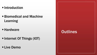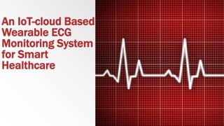 The document outlines the development of an IoT-cloud based ECG monitoring system for elderly patient healthcare, focusing on biomedical and machine learning techniques for arrhythmia detection. It details hardware components, including an ECG sensor and Bluetooth module, and describes the cloud infrastructure utilizing services like Firebase and AWS for real-time data processing and storage. The system aims to provide efficient remote monitoring and analysis, improving healthcare access for patients unable to navigate modern technology.