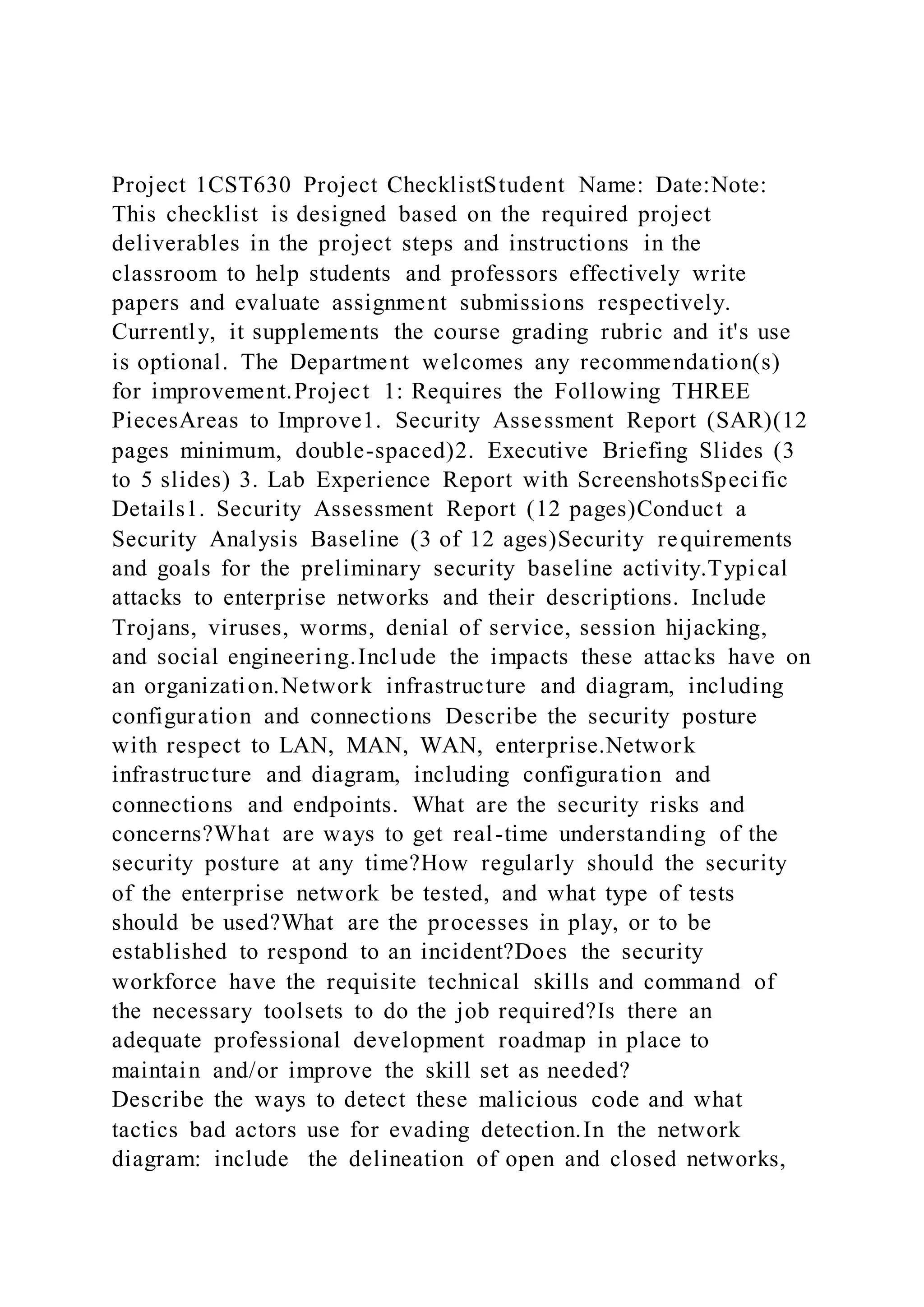 The document outlines project checklists for a cybersecurity course, detailing the required deliverables for multiple projects, including security assessments, incident reports, and strategic plans. Each project specifies components such as executive summaries, lab reports, and executive briefing slides, emphasizing the need for in-depth analysis and documentation related to cybersecurity measures and protocols. The checklists aim to guide students in completing their assignments while also providing an optional framework for professors to evaluate submissions.