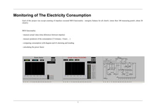 This document discusses monitoring electricity consumption through a management and energy system (MES). The MES measures actual electricity consumption values by counting impulses from over 100 measuring points for 20 clients. It also predicts short-term consumption, compares usage to diagrams to detect alarms or trends, and calculates the power factor. A block scheme is provided to explain the full system.
