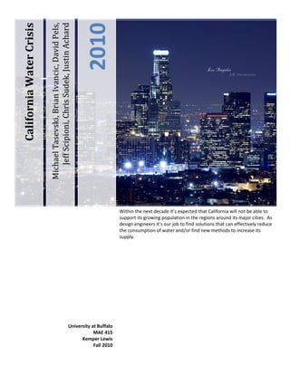 The document discusses potential solutions to California's growing water crisis over the next decade as the state's population increases substantially. It outlines customer requirements for a new water system, including that it must be environmentally friendly, economically viable, energy efficient, positively received, and produce high quality water. Engineering specifications are proposed that correspond to the customer requirements, such as the system using renewable energy for 80% of its power and producing at least 35,500 acre-feet of water per day. Key factors in selecting a design are identified as the energy source, water storage capacity, and system location based on their influence on important customer needs.