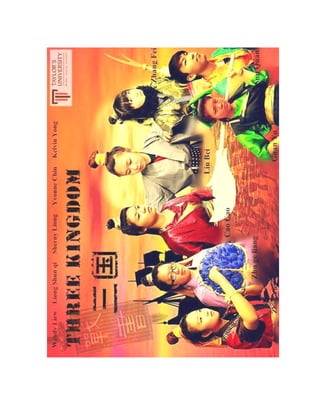 The document provides background information on a group project for a Culture and Civilization class. The project requires students to examine similarities and differences between Eastern and Western civilizations by researching the Three Kingdoms period in Chinese history. The group researched characters and plots from the Three Kingdoms story and Three Kingdoms movie to develop a script for a short dramatization. They summarized their research, outlined a storyline, and included the script and descriptions of costumes and props for key characters like Liu Bei, Guan Yu, Zhang Fei, Zhu Ge Liang, Sun Quan, Cao Cao, and Zhou Yu.