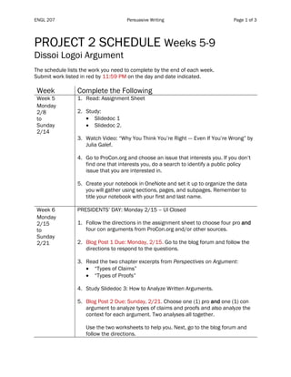 This document outlines the schedule and assignments for a persuasive writing project over 5 weeks. It includes analyzing sample arguments, creating Toulmin diagrams, drafting a rhetorical analysis paper and pro/con editorials on a chosen topic, and participating in peer reviews. Key deliverables are blog posts analyzing and diagramming arguments each week, with a rhetorical analysis paper and paired pro/con editorials due at the end.