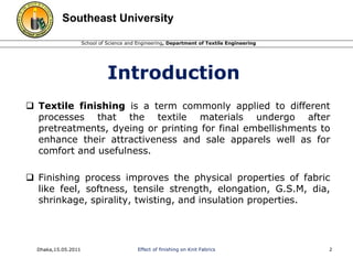 This document discusses the effect of finishing processes on knit fabrics. It describes how finishing improves physical properties like feel, strength and shrinkage. The techniques of finishing depend on factors like the fabric composition and its intended end use. Common finishing treatments aim to impart properties like softness, luster and dimensional stability. The document then examines specific finishing stages like hydroextraction, drying, slitting, stenting and compacting. Graphs show how properties like GSM and shrinkage are affected differently for various fabric types as they progress through finishing. The discussion analyzes the results and references additional sources for information on textile finishing.