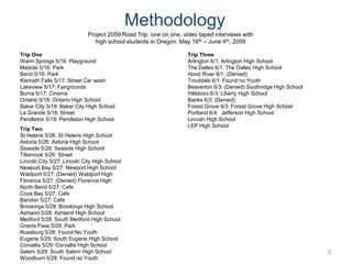 Oregon's youth are concerned about three main issues - the economy, education funding, and the environment. Regarding the economy, they see a lack of jobs and need for new industries in their communities. For education funding, students worry about budget cuts affecting their schools. They feel more funding is needed for programs. On the environment, youth value Oregon's natural beauty and want to protect natural resources. Overall, they feel their voices are not heard in community and statewide decision-making but want to be involved to help address these important issues facing their state.