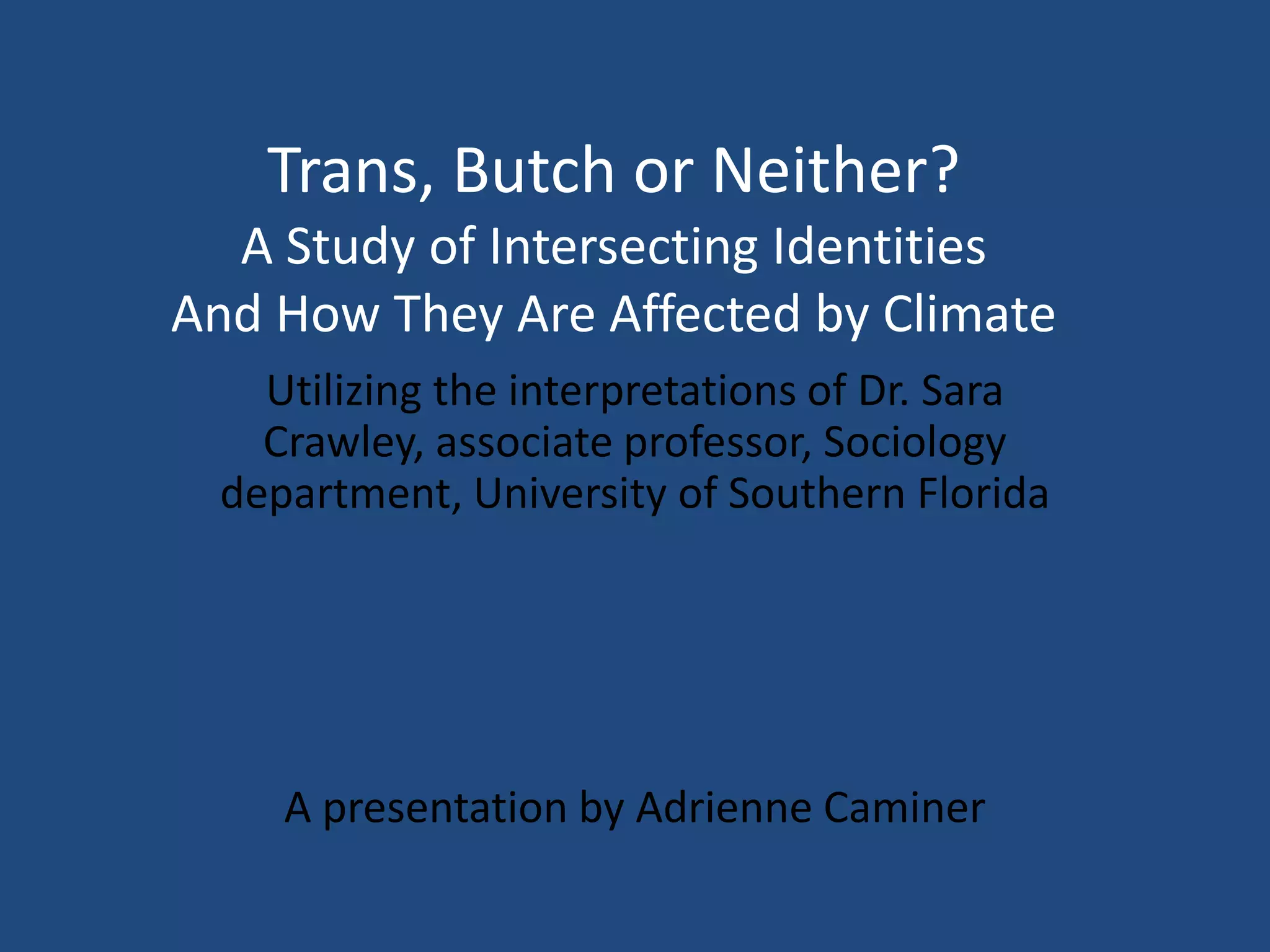 This document summarizes a presentation about how intersecting identities of being trans, butch or neither can be affected by climate. It discusses stone butch, FtM and transgender identities and performances of gender. It focuses on the experience of Dr. Sara Crawley, who finds that living in a warm climate of Southern Florida impacts the types of clothing typically used to convey masculine gender identities. Specifically, high temperatures allow Crawley to feel masculine while wearing minimal clothing like sports bras and shorts. The presentation examines how climate and region can influence gender expression through clothing and how identity is not solely defined by appearance.