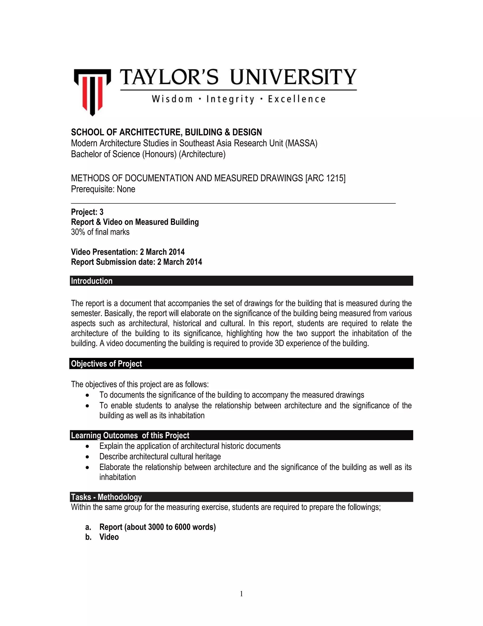 This document outlines the requirements for a project on measuring and documenting a building as part of an architecture course. Students are assigned to groups to measure a building and prepare a report and video presentation. The report must be between 3,000-6,000 words and document the architectural, historical, and cultural significance of the building. It must analyze the relationship between the architecture and its significance/use. The accompanying video should provide a 3D experience of the building and cover either its history/architecture or culture/architecture. The project aims to teach students how to apply architectural documentation and describe cultural heritage as well as the link between a building's design and purpose.