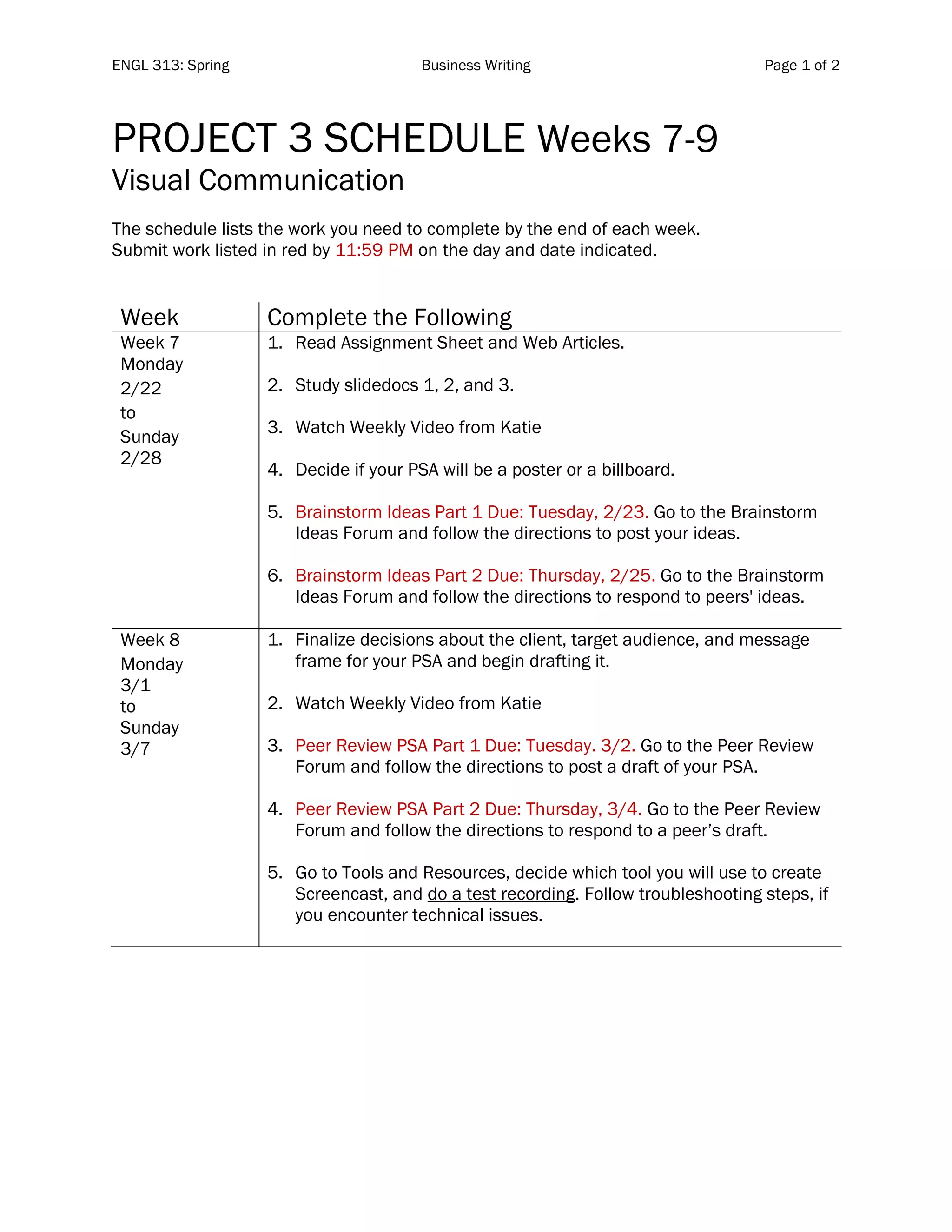 This document outlines the schedule and assignments for Project 3 of the ENGL 313 Spring Business Writing course over Weeks 7-9. It details the following key deliverables: 1. A public service announcement (PSA) poster or billboard due Week 9 promoting a client's message to a target audience. 2. A screencast design justification due Week 9 explaining design choices for the PSA. 3. Peer reviews of drafts and screencasts are due throughout Weeks 7-9 to provide feedback. 4. The final PSA and screencast URL are due as deliverables by the end of Week 9. Students must verify their submissions are correct.
