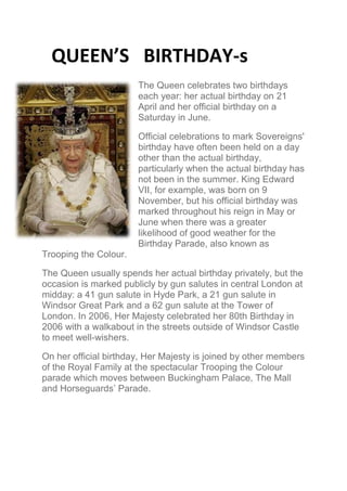- Queen's Birthday in June which involves Trooping the Colour parades in London.