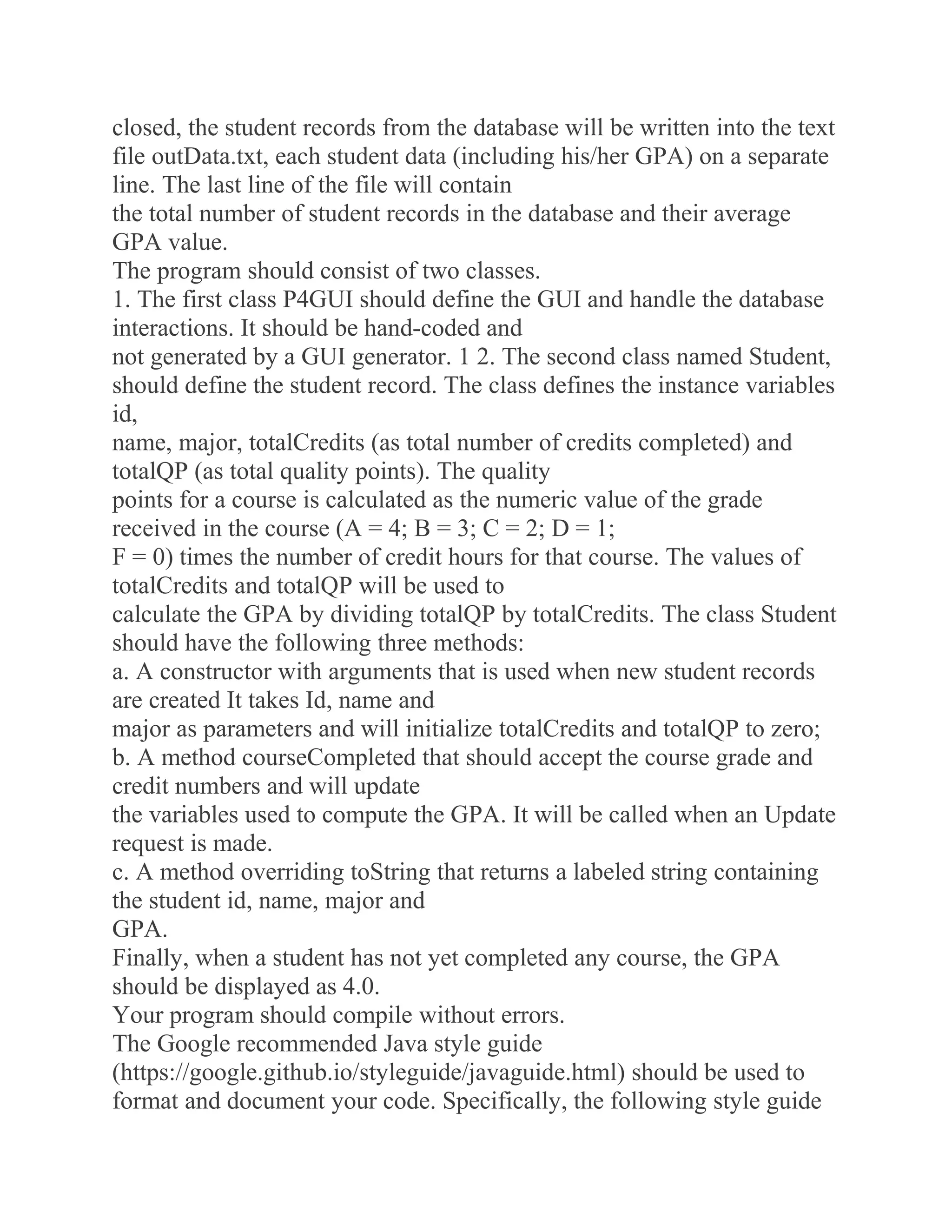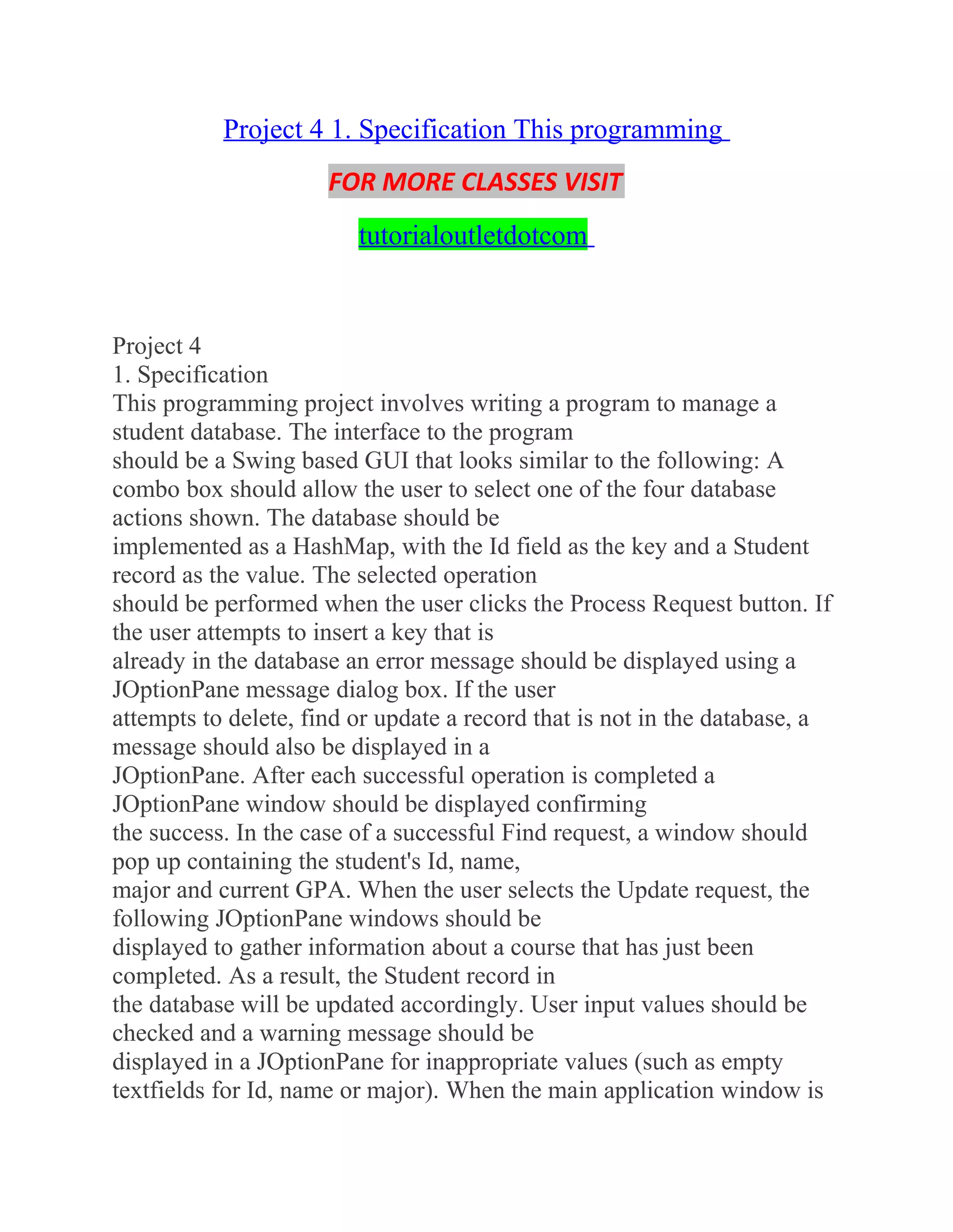 The document outlines the specifications for a programming project that involves creating a student database management program using a Swing-based GUI and a HashMap. The program should manage student records with operations such as insert, update, delete, and find, while properly handling errors and confirming successful operations through JOptionPane dialogs. Additionally, it details the requirements for class structures and coding conventions, as well as submission requirements and a grading rubric for evaluation.