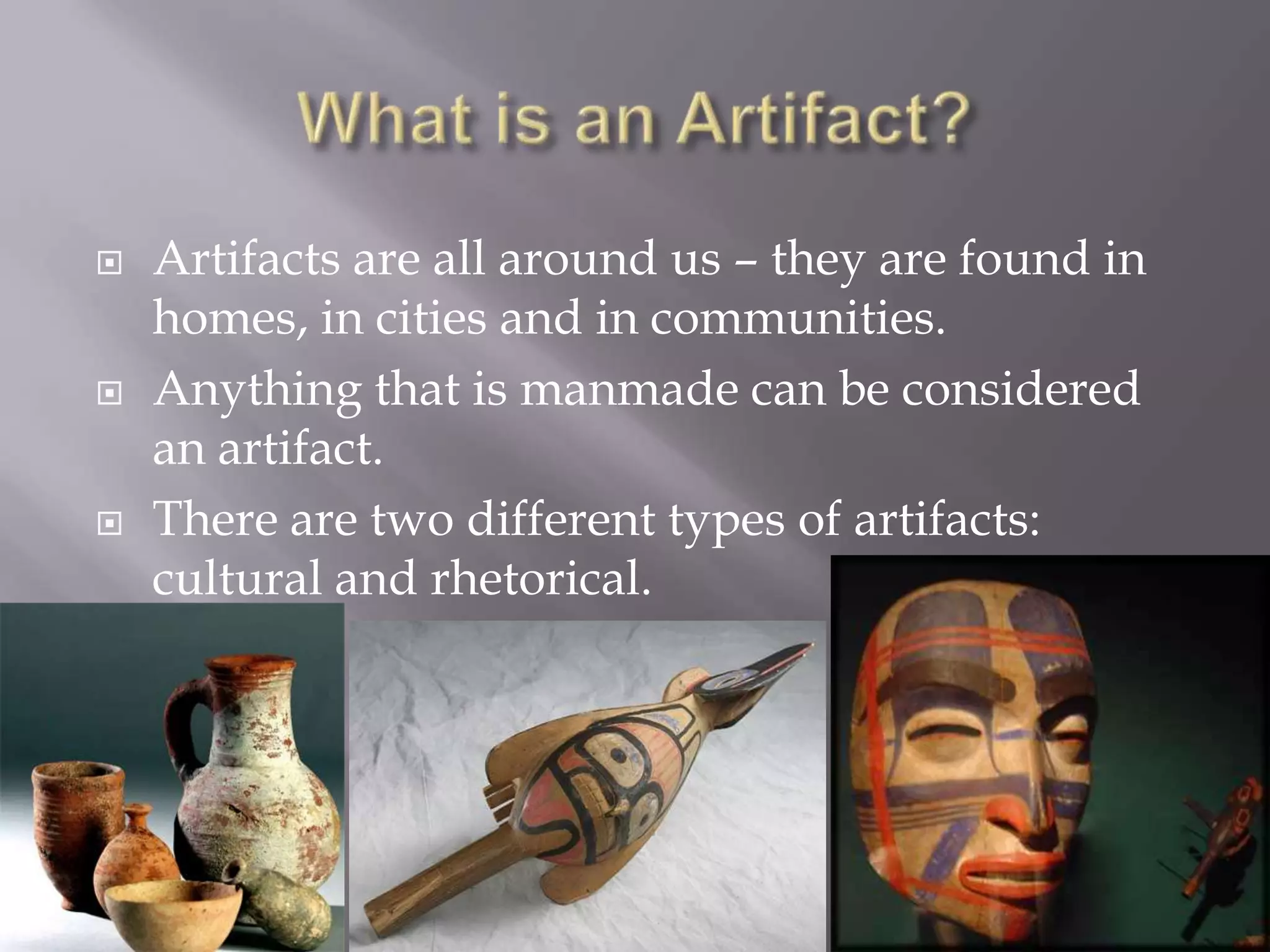 This document discusses analyzing artifacts and provides examples of cultural and rhetorical artifacts. It describes how to analyze a rhetorical artifact by choosing one from an abundant location, finding its deeper meaning, and considering its audience and purpose. The document includes a case study where the author analyzes exhibits in a wildlife hall suggesting they promote family values, and discusses futuristic artifacts like the iPod, Avatar movie, and an assignment to analyze an innovative artifact.