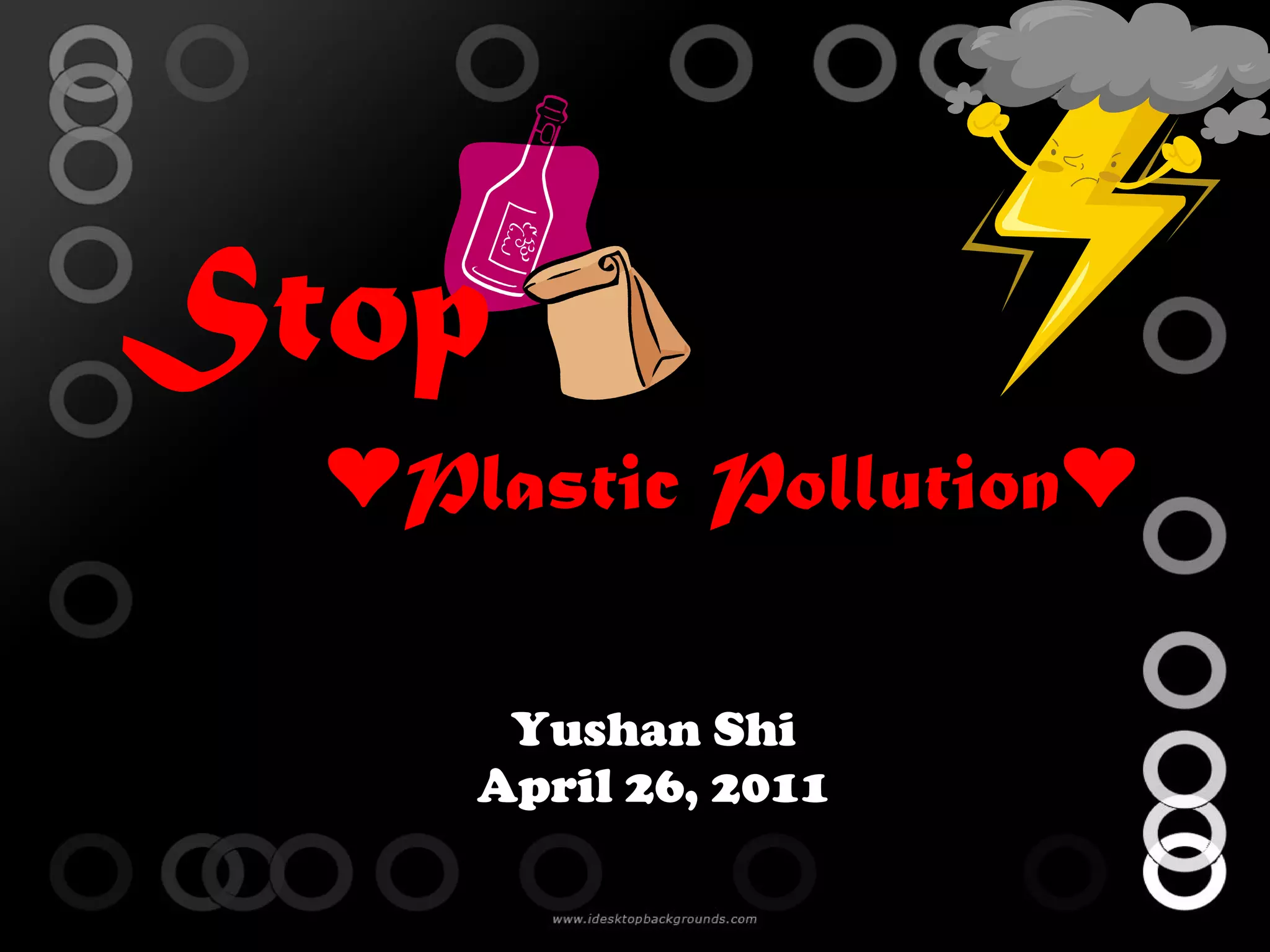 Plastic pollution is a major problem worldwide. Over 500 billion plastic bags are used each year, and it can take plastic bags up to 1000 years to degrade. Plastic waste ends up in oceans, where it is ingested by various marine animals and bird species, causing injury and death. A market-based solution of charging a nominal fee per plastic bag has been shown to significantly reduce plastic bag usage in places where it was implemented. While plastic bag bans aim to address the issue, they fail to solve the root problem and may shift production to other materials like paper bags that also have environmental impacts. An effective solution needs to discourage wasteful plastic bag use while not banning them outright.