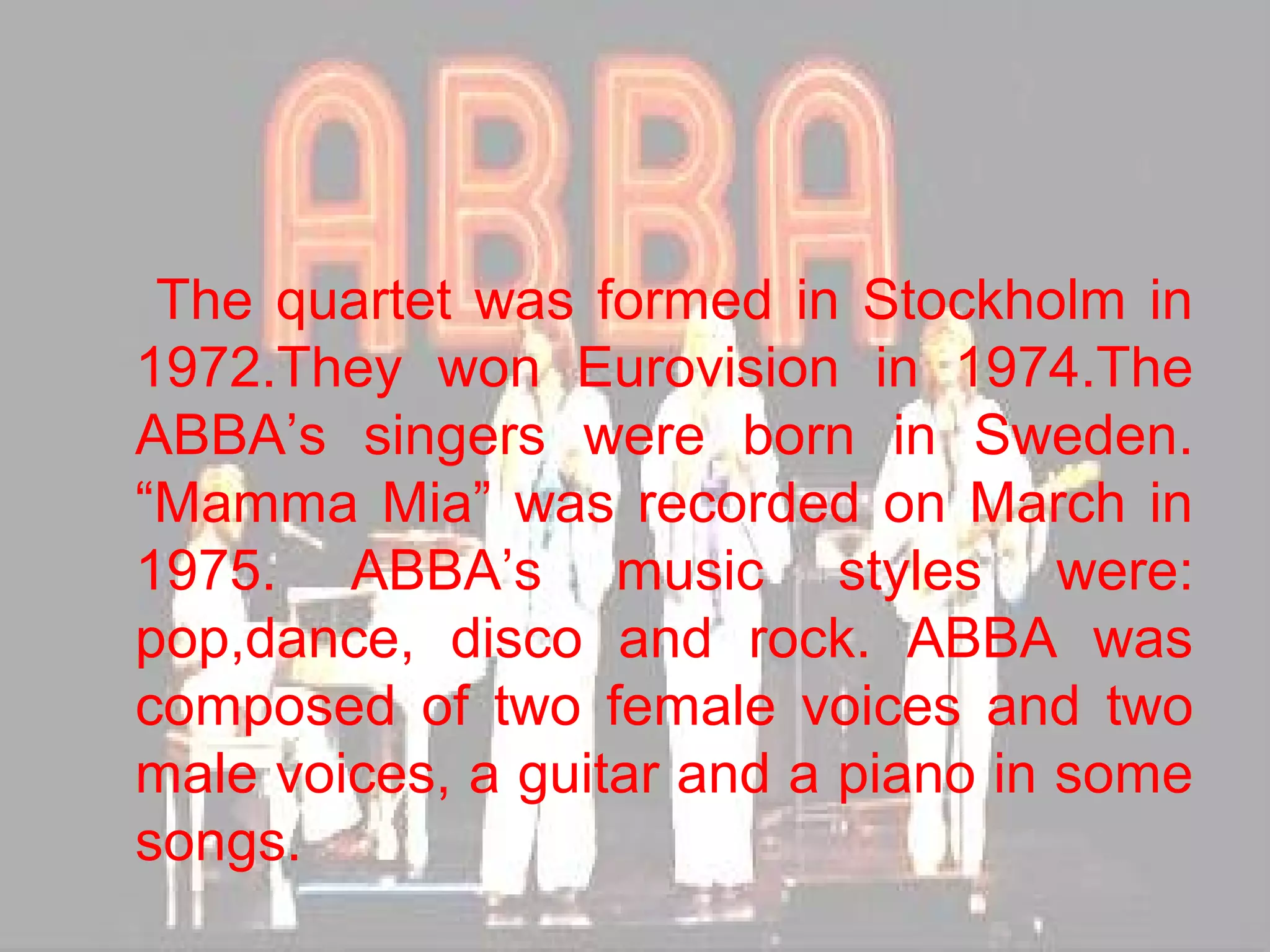 The document provides biographical information on multiple musical artists, including ABBA, Francis Albert Sinatra, John Lennon, Red Hot Chili Peppers, Survivor, Elvis Presley, Michael Jackson, Tina Turner, Queen, Antonio Vivaldi, and Bob Marley. It describes their places of birth, years of life, musical styles, famous songs, instruments played, and other key details.