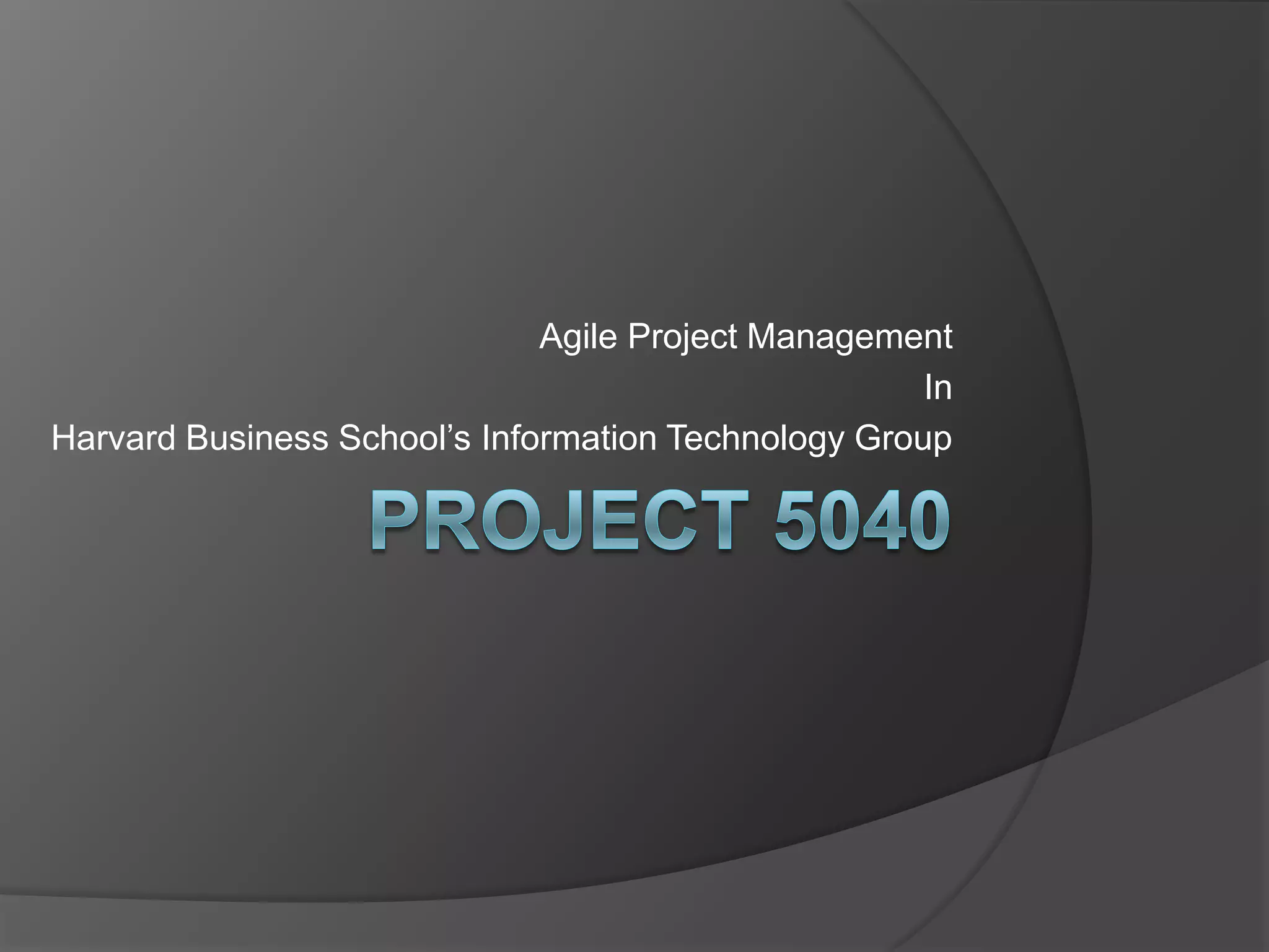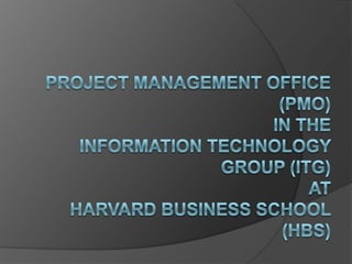 The document discusses agile project management principles and how they are implemented at Harvard Business School's Information Technology Group (ITG). It provides an overview of agile methodology, the agile manifesto, and its key principles. It then explains how ITG structures its project management office (PMO) and operationalizes agile principles through practices like iterative delivery, daily collaboration between teams and stakeholders, self-organizing agile teams, and regular reflections to improve.