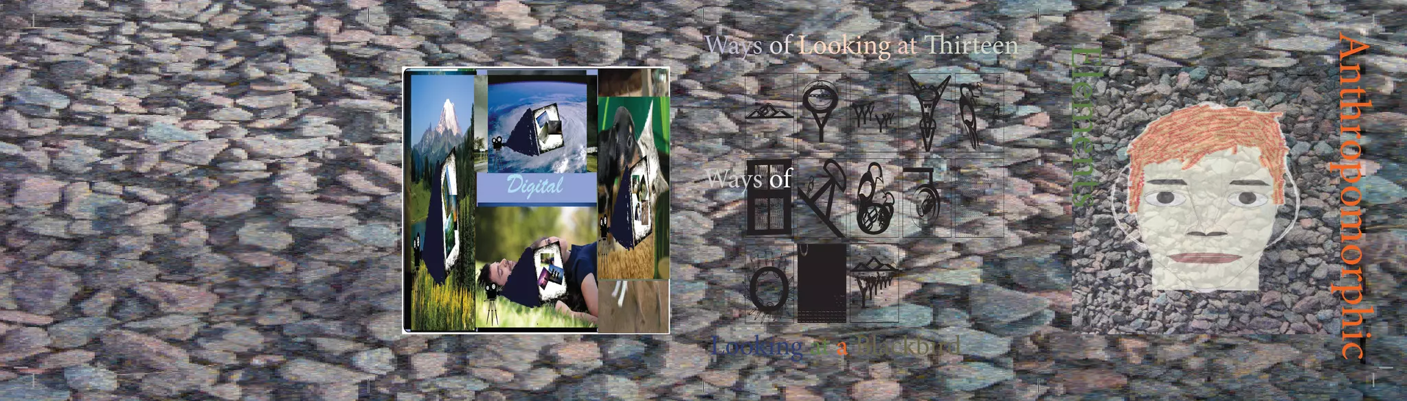 Ways of Looking at Thirteen uses anthropomorphic elements and symbols to represent looking at a blackbird from multiple perspectives. The document depicts the bird with overlapping and interconnected shapes that become more abstract. It suggests the experience of observing the blackbird can be understood from various vantage points that provide different but related insights.