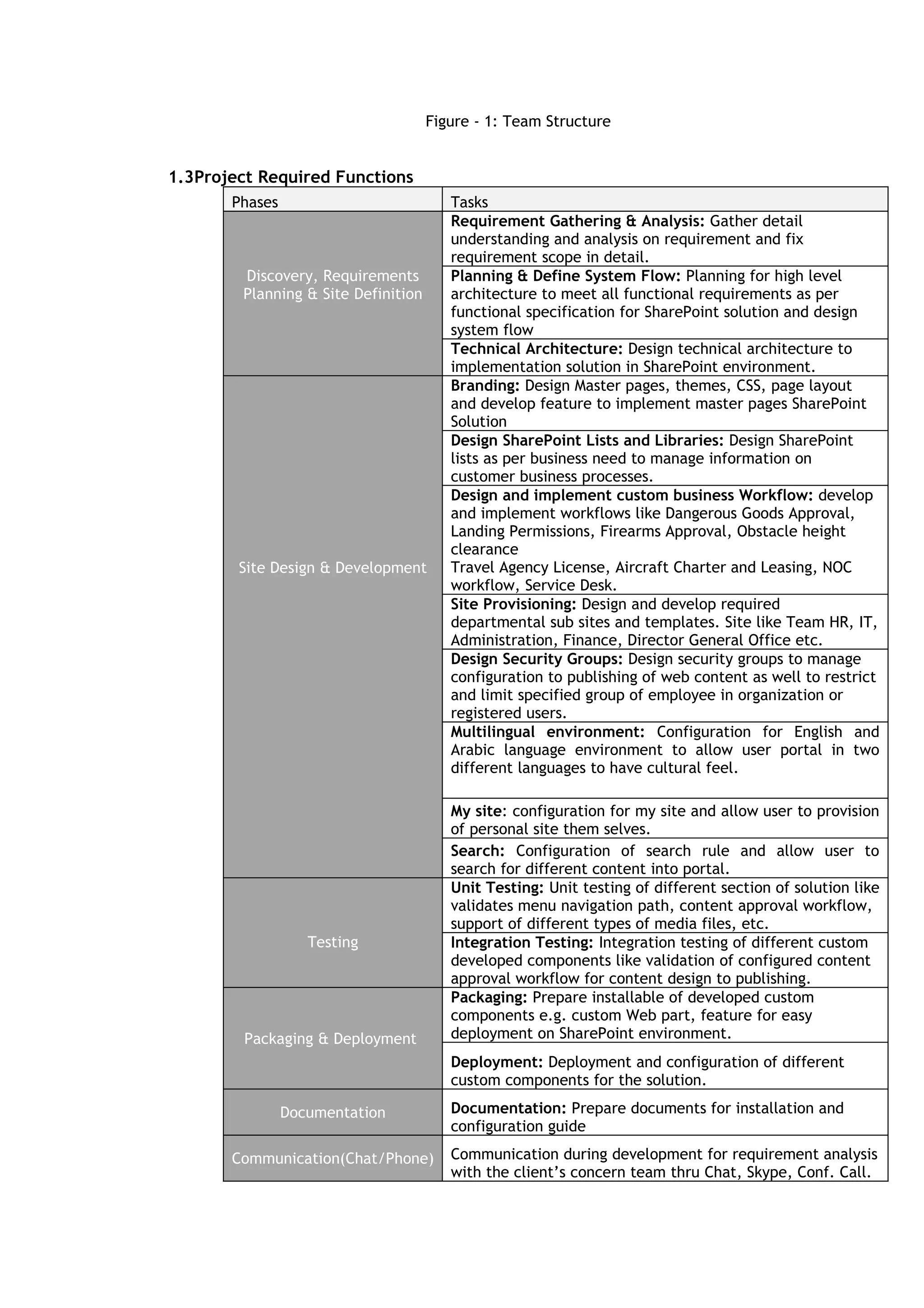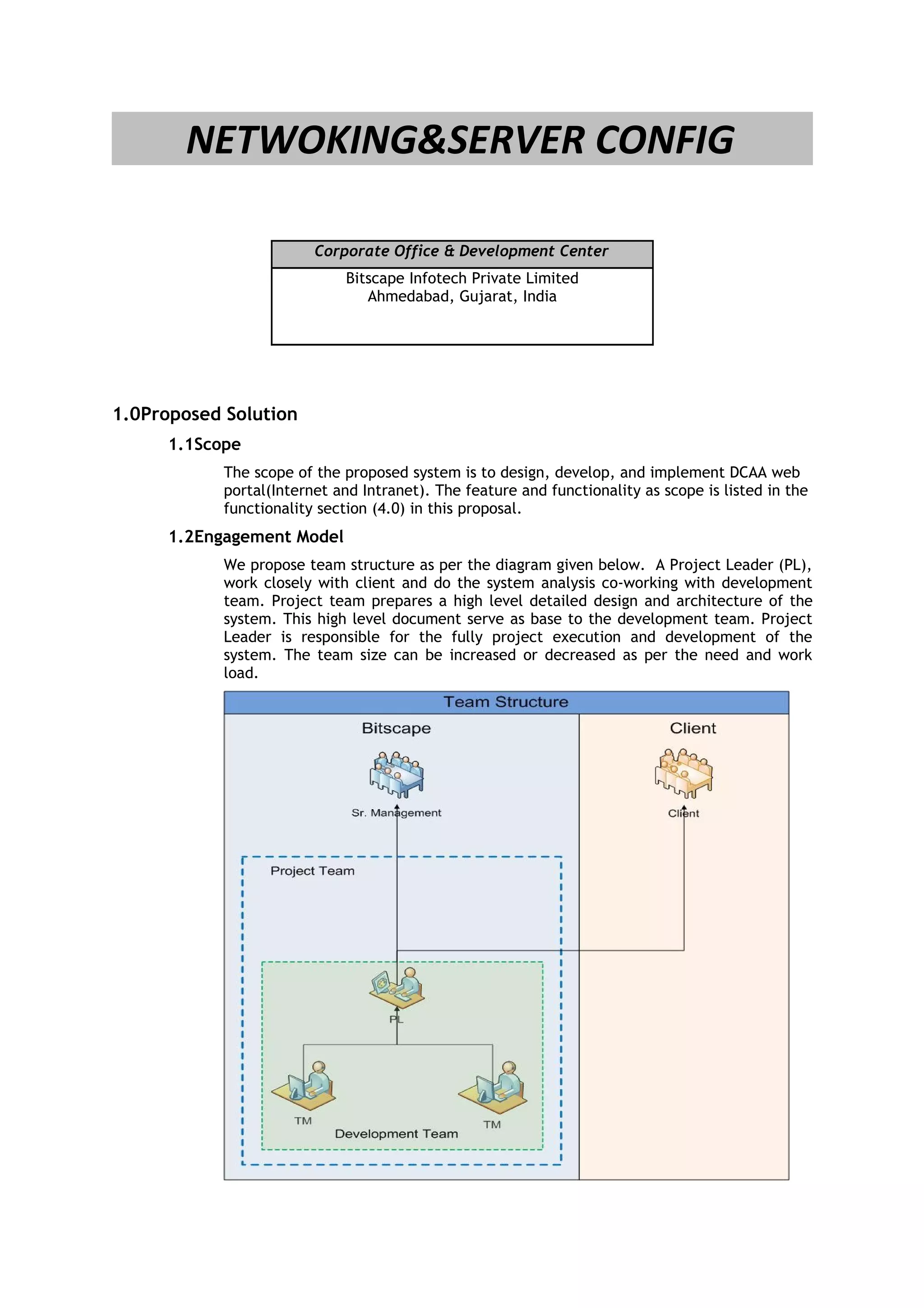 The document proposes a solution to design, develop, and implement a DCAA web portal. It outlines a team structure with a Project Leader responsible for execution. The scope includes requirements gathering, design, development, testing, packaging, deployment, and documentation. It recommends software and hardware for the operating environment and lists user browser support. Costs provided are based on 218 man days of effort across phases. The proposed timeline is 106 working days total.