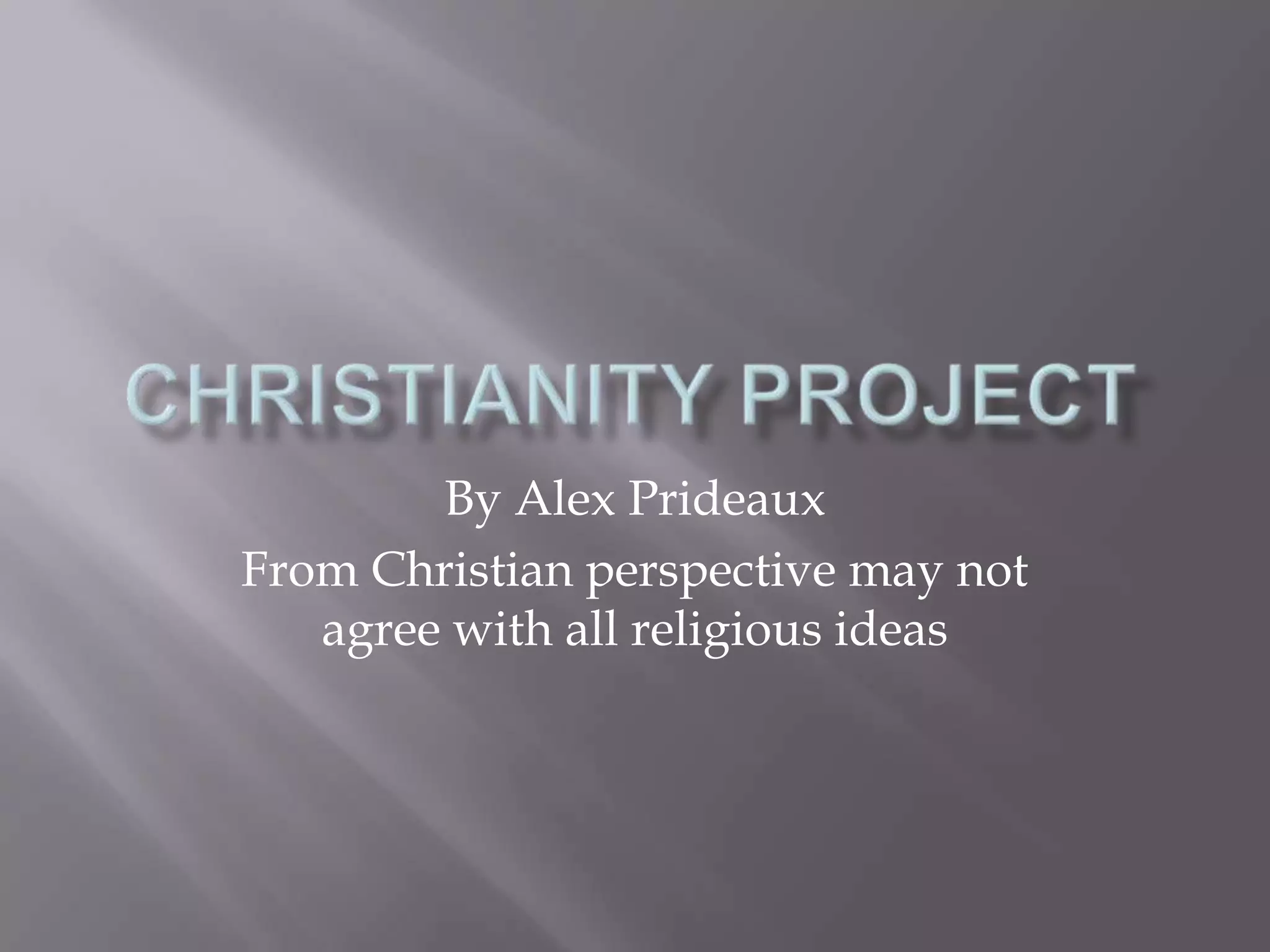 This document summarizes key aspects of Christianity including symbols, celebrations, holy places, important figures, core beliefs, rituals, and holy writings. It discusses Jesus as the central figure and messiah in Christianity. Key symbols include the cross representing Jesus' resurrection and the star of Bethlehem guiding the shepherds. Major celebrations are Christmas marking Jesus' birth and Easter commemorating his resurrection. Important locations are churches as places of worship and Bethlehem as Jesus' birthplace. The Bible contains Christian beliefs and consists of the gospels of Matthew, Mark, Luke and John.