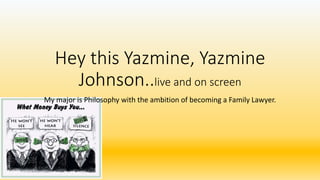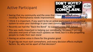 Yazmine Johnson is a philosophy major with ambitions of becoming a family lawyer. She is an active participant in her community who recently supported a bond issue to fund a new high school. She has learned about the multi-step process that political parties use to organize elections and recruit/aid candidates. Immigration is an ongoing issue that will be discussed for generations, and tensions currently exist regarding building a border wall and restricting travel. The 1st Amendment, which protects freedom of religion, speech, press and assembly, establishes important basic human rights and provides the foundation for other rights. Media has significant influence over the dissemination of information.