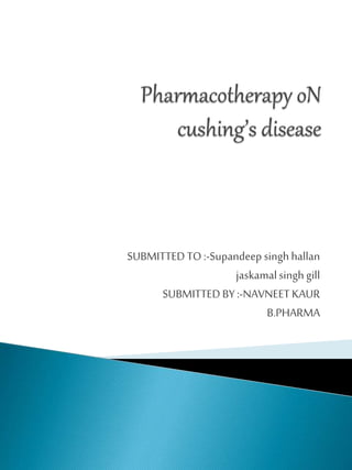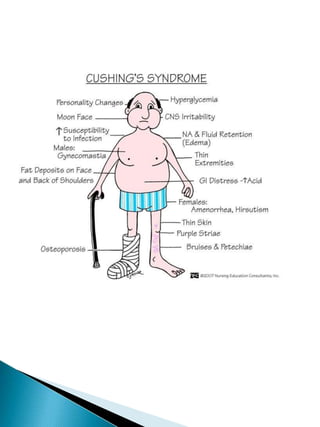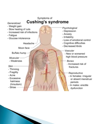 Cushing's syndrome is caused by excessive cortisol production and can be difficult to diagnose due to shared symptoms with other conditions. It may be endogenous from pituitary or adrenal tumors, or exogenous from long-term high-dose corticosteroid use. Diagnosis involves ruling out other conditions through tests and assessing cortisol levels in blood and urine over 24 hours. Treatment aims to normalize cortisol levels and depends on the underlying cause, such as surgery to remove tumors or medication to reduce cortisol production. Left untreated, Cushing's syndrome can cause serious health issues.