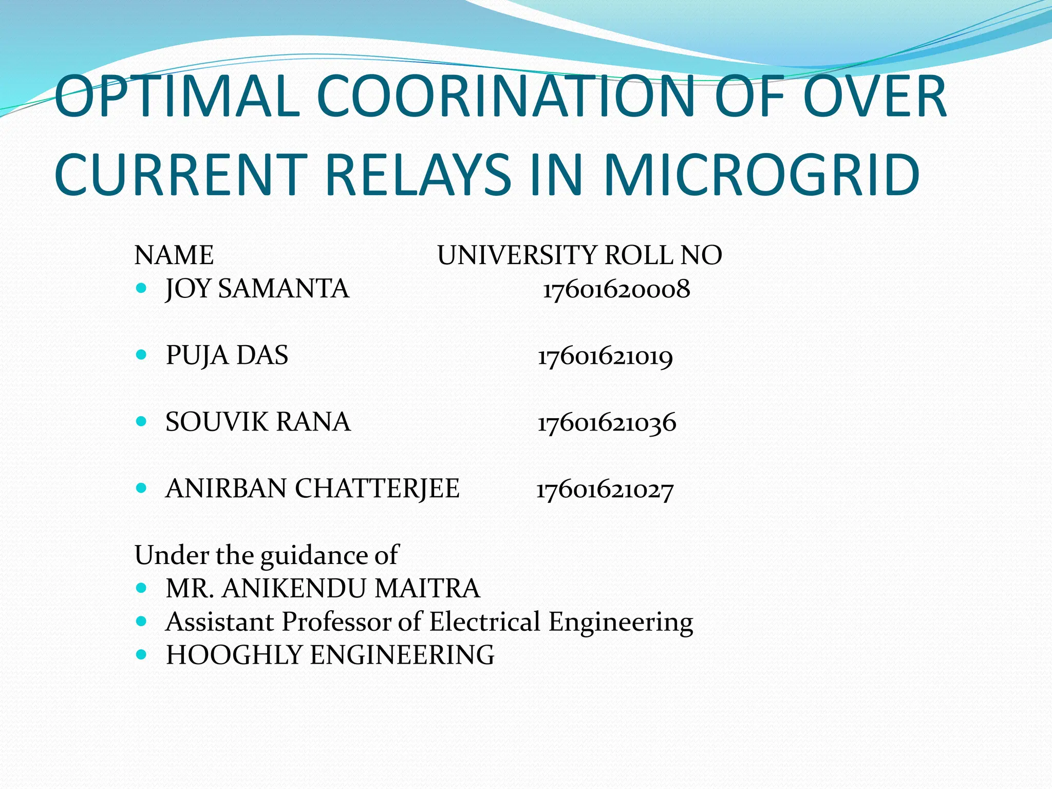 This document discusses optimal coordination of overcurrent relays in microgrids. It begins with an introduction to microgrids and distribution systems. It then discusses the IEEE 15-bus system which will be used as a case study. Load flow and fault analysis will be performed on the IEEE 15-bus ETAP model. Algorithms are proposed to coordinate overcurrent relays by analyzing line and load data from the IEEE 15-bus standard model. Key parameters like maximum load current and fault locations will be identified.
