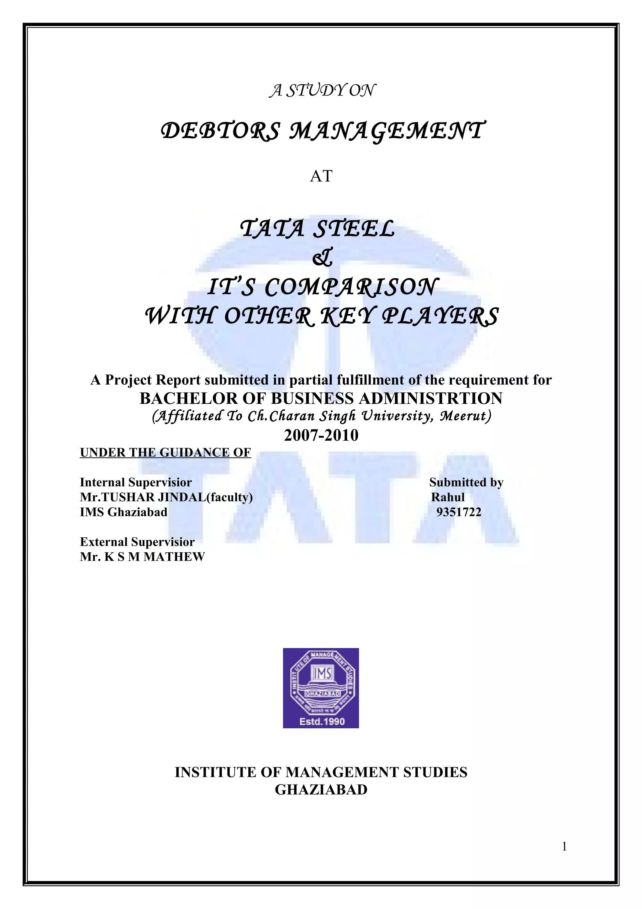 The document discusses debtors management at Tata Steel and its comparison with other key players. It provides an overview of accounts receivable and debtors management. It then gives the background of Tata Steel, including its history and an overview of its finance division and sundry debtors section. The document examines Tata Steel's credit monitoring processes and compares its debtors management practices to other steel companies like SAIL and ArcelorMittal. It also discusses how Tata Steel dealt with the recession and provides suggestions to improve its debtors management.
