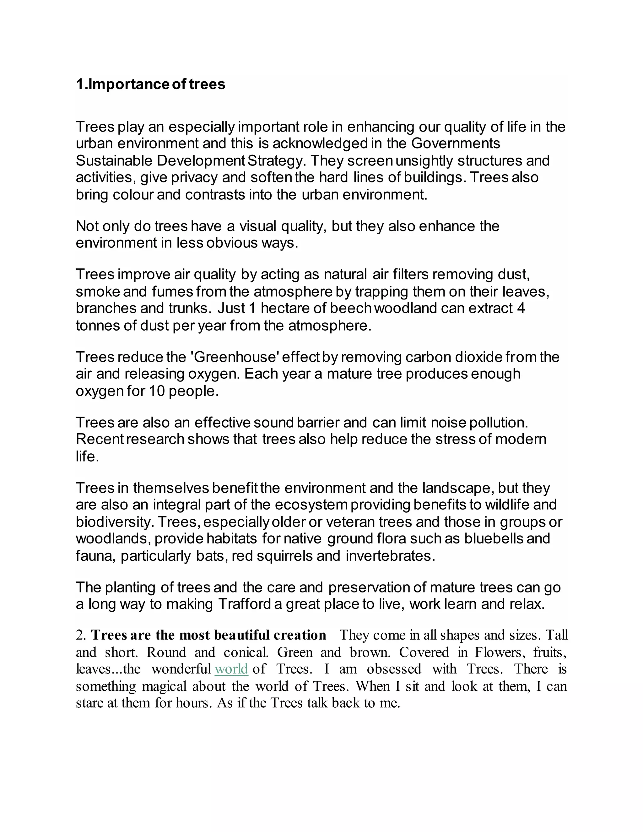 1. Trees play an important role in the environment by improving air quality, reducing greenhouse gases, providing habitats for wildlife, and reducing noise pollution. They remove pollutants from the air and produce oxygen. Mature trees can produce enough oxygen for 10 people each year. Trees also help reduce stress.