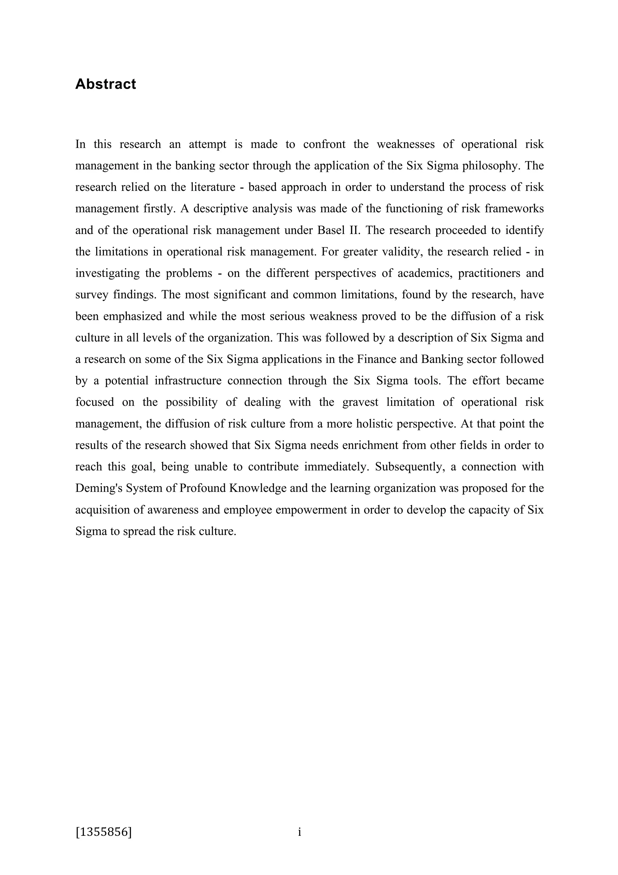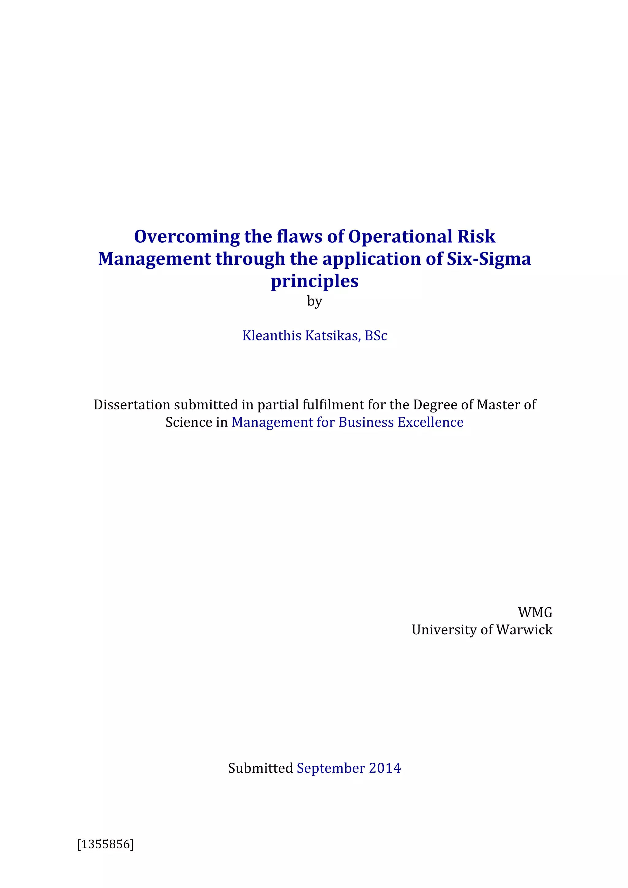 This document is a dissertation abstract that discusses overcoming flaws in operational risk management in banking through the application of Six Sigma principles. It first describes the literature-based research conducted to understand operational risk management and limitations identified. The most significant limitation found was the lack of a risk culture embedded in all organization levels. It then provides an overview of Six Sigma and applications in finance/banking sectors. The dissertation focuses on addressing the critical limitation of not having a risk culture through a more holistic perspective by enriching Six Sigma with Deming's System of Profound Knowledge and learning organization theories to develop employee awareness and empowerment to help spread a risk culture.