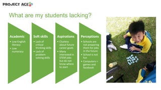 This document discusses a project aimed at improving students' academic, soft, and career skills through coding education. It notes students currently lack English and math literacy, critical thinking, and career goals. The project will provide twice weekly coding classes using Exploring Computer Science curriculum, along with holiday classes and intensives. Students will gain skills in computational thinking, problem solving, teamwork, and entrepreneurship. Beneficiaries include 30 Form 2-4 students balanced by gender. The timeline outlines preparation, execution, enrichment, and sustainability phases. Key targets are a 90% completion rate and two student startups launched. Support is requested in the form of volunteers, mentors, speakers, equipment, and funding.
