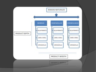 This Peruvian company produces and sells natural juices made from fruits like aguaymanto, granadilla, camu-camu, and orange. Their mission is to provide excellent service and a natural product with health benefits. They analyze their strengths like fruit knowledge, direct sales, and low costs, as well as weaknesses like limited administration knowledge. Their market research found many people know the fruits and their benefits and like the juice flavors. They plan to introduce new "cremolada" products made from the same fruits to attract more customers.
