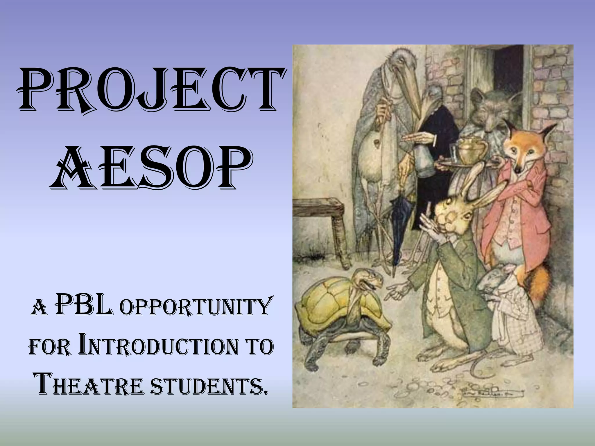 This document outlines Project Aesop, a theatre-based project for introduction to theatre students. Students will learn about Greek theatre, script writing, and character development. They will work in groups to write and perform original fables in the style of Aesop's fables. Interdisciplinary connections include having an art class design masks for performances and possibly recording performances as films. Students will produce a public performance of their fable plays and receive feedback through self and peer critiques. Technology will be integrated through online research and potentially digitizing character profiles and performances. The timeline spans several weeks for students to research, write, rehearse, and perform their fables.