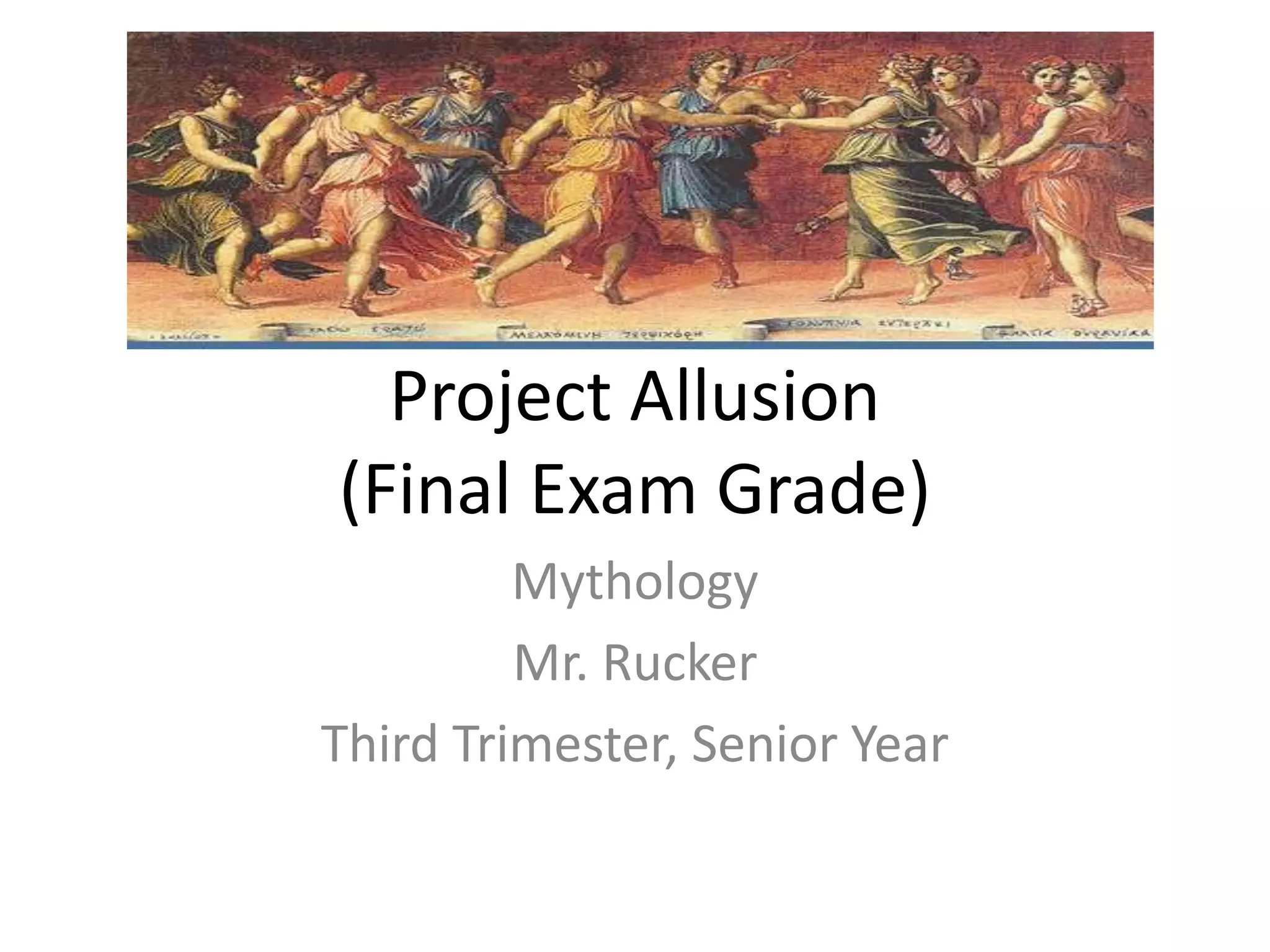 The document details an assignment for a final exam in a mythology course, requiring students to choose a lesser-known character or story from Greek/Roman mythology and create a PowerPoint presentation. Students must include various types of allusions from pop culture, such as examples from music, art, and advertisements, as well as provide thorough background information. The presentation must adhere to specific requirements and will contribute to the students' final grades, with the due date set for June 22.